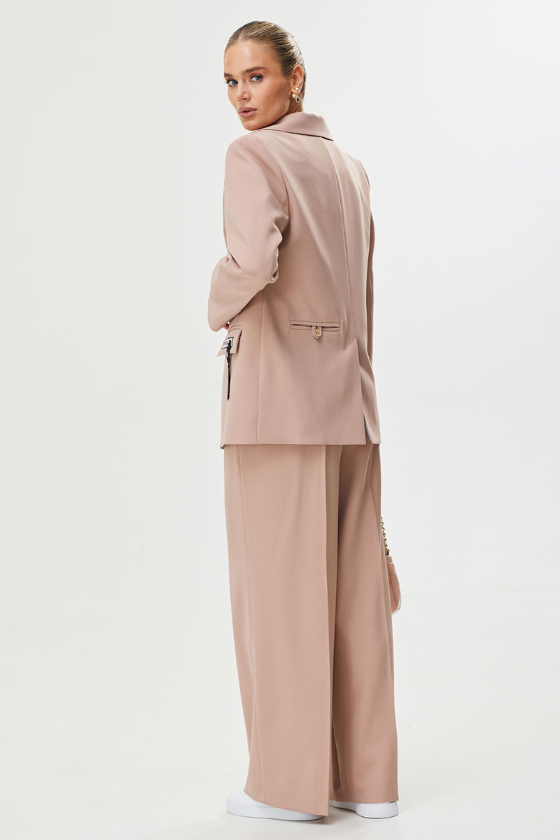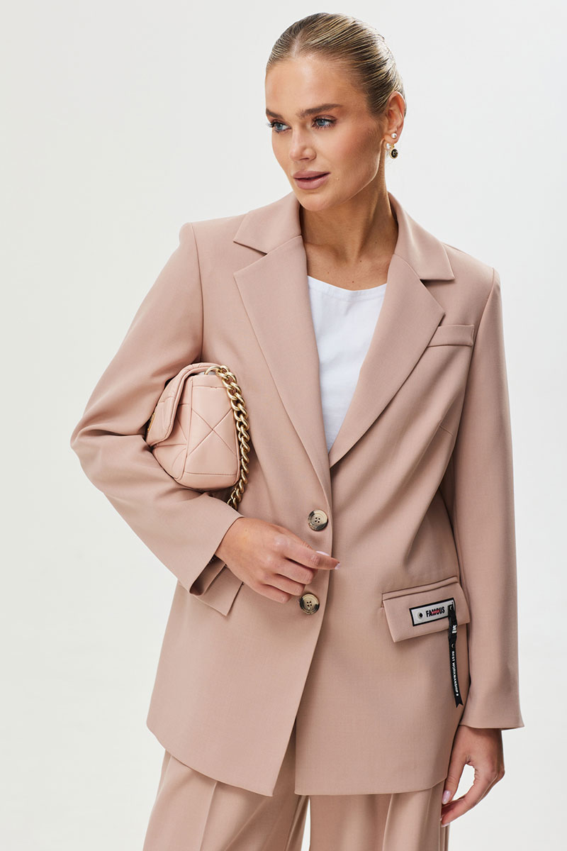 Жакет полуприлегающего силуэта, на подкладке, с одноботной застежкой на петли и пуговицы. Горловина жакета оформлена воротником пиджачного типа. В области бедер обработаны прорезные карманы "в рамку" с клапаном. Спинка жакета со средним швом, заканчивающийся шлицей, левая часть спинки с прорезным карманом в рамку, вход в который фиксирует навесная петля с пуговицей.