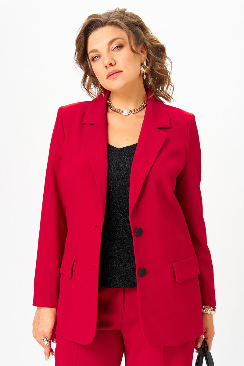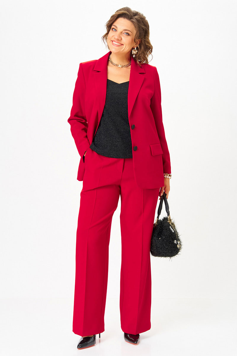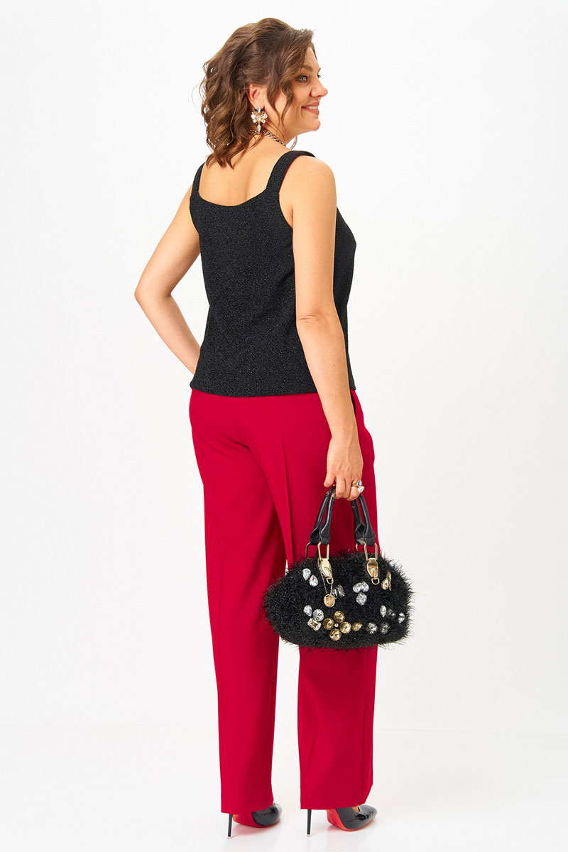 Комплект женский 3-х предметный, состоящий из жакета, топа и брюк. Жакет прямого силуэта, с застежкой на две петли и две пуговицы, на контрастной подкладке из поливискозы. Перед жакета с нагрудными вытачками и прорезными карманами с клапаном. Спинка жакета со средним швом. Рукава двухшовные втачные. Горловина оформлена воротником пиджачного типа. Брюки классической формы, прямого силуэта, со стрелками по передним и задним половинкам. Верхний срез обработан обтачным поясом. В боковых швах брюк обработаны наклонные карманы. Застёжка центральная на тесьму-молнию и крючок. В модели использована фурнитура контрастного цвета. Топ прямого силуэта на широких бретелях, выполнен из трикотажного полотна с люрексом. Перед с нагрудными вытачками. Горловина переда лёгкой V-образной формы. Спинка цельнокроеная.