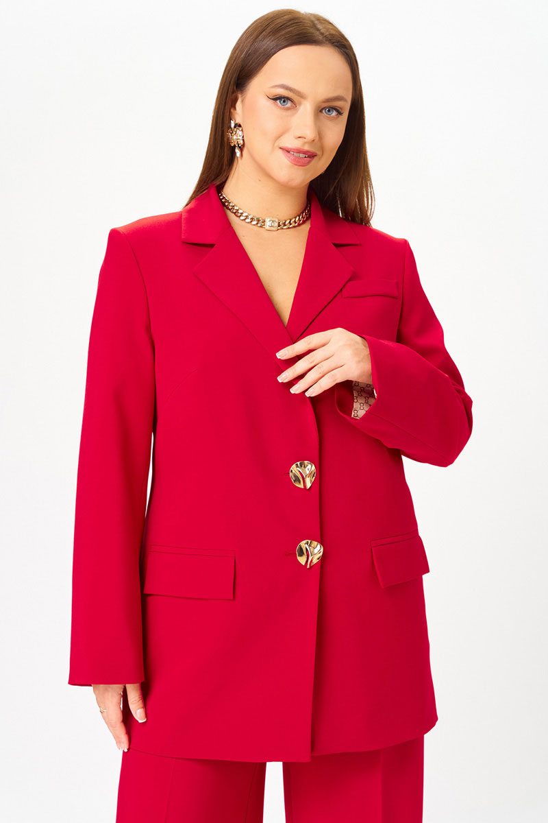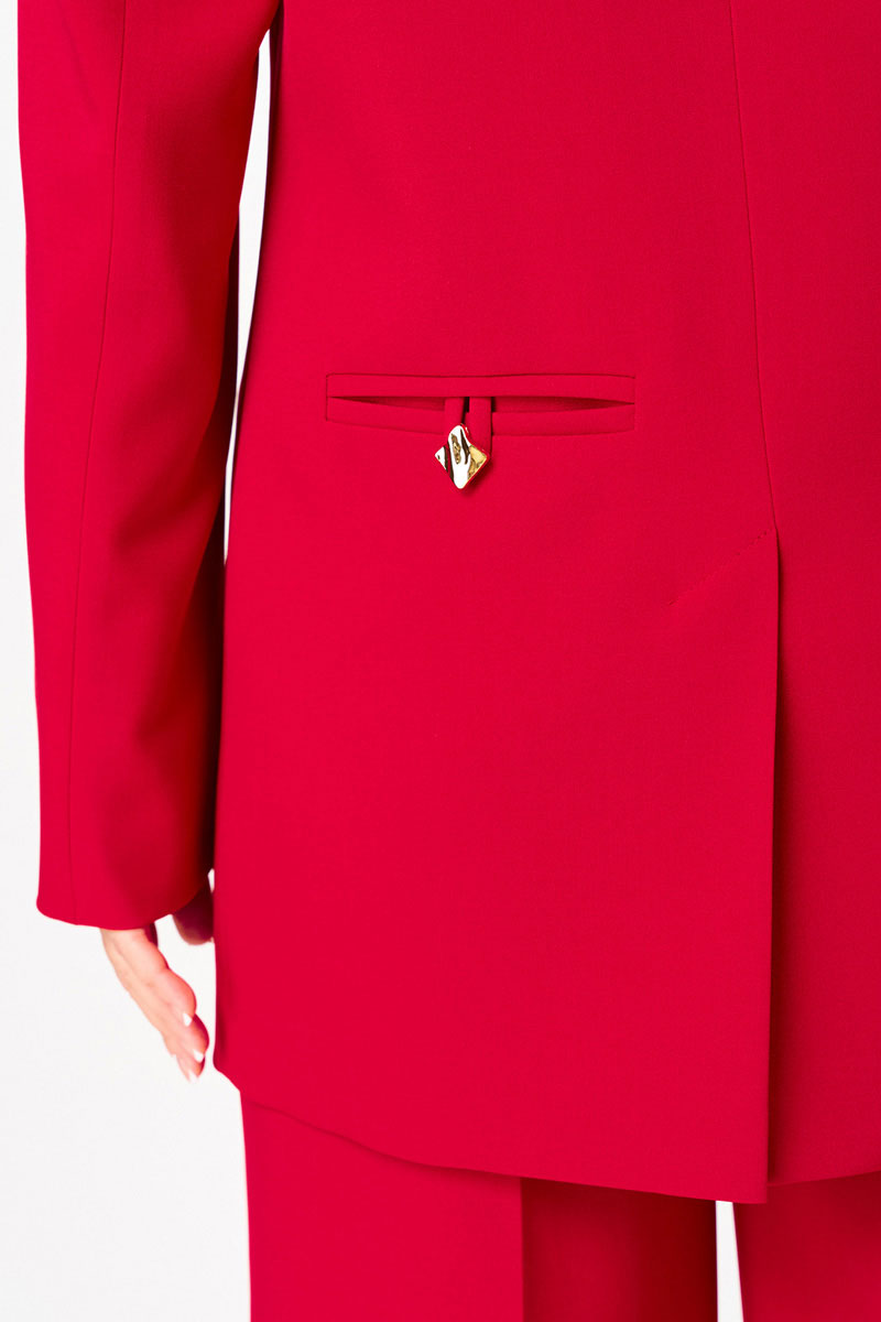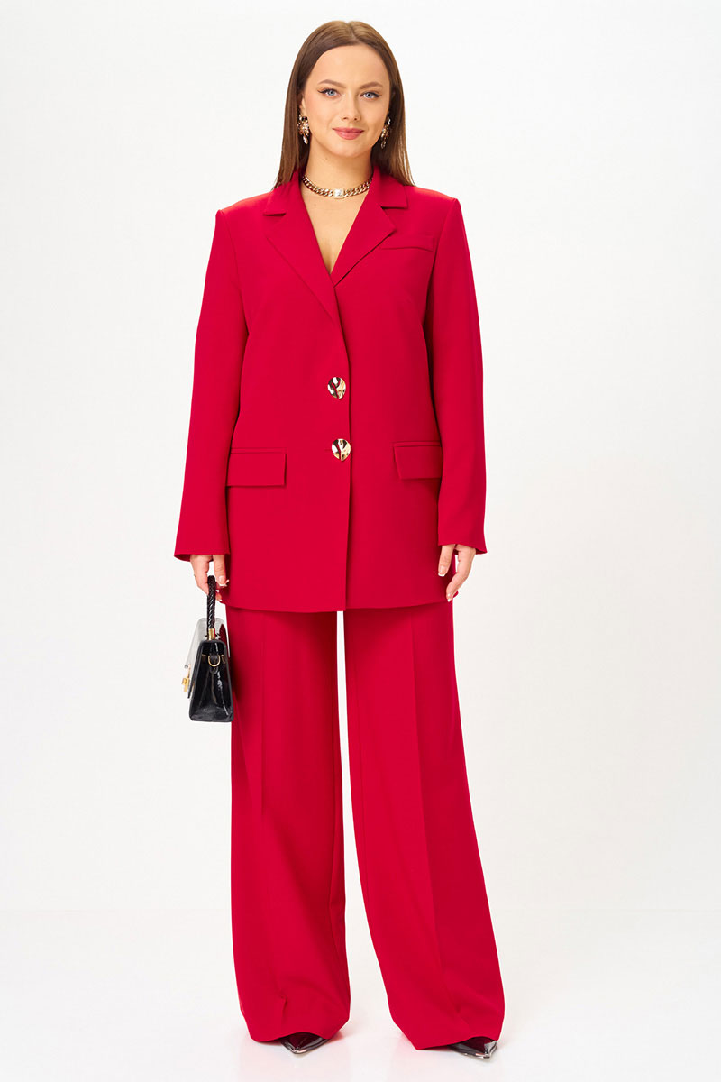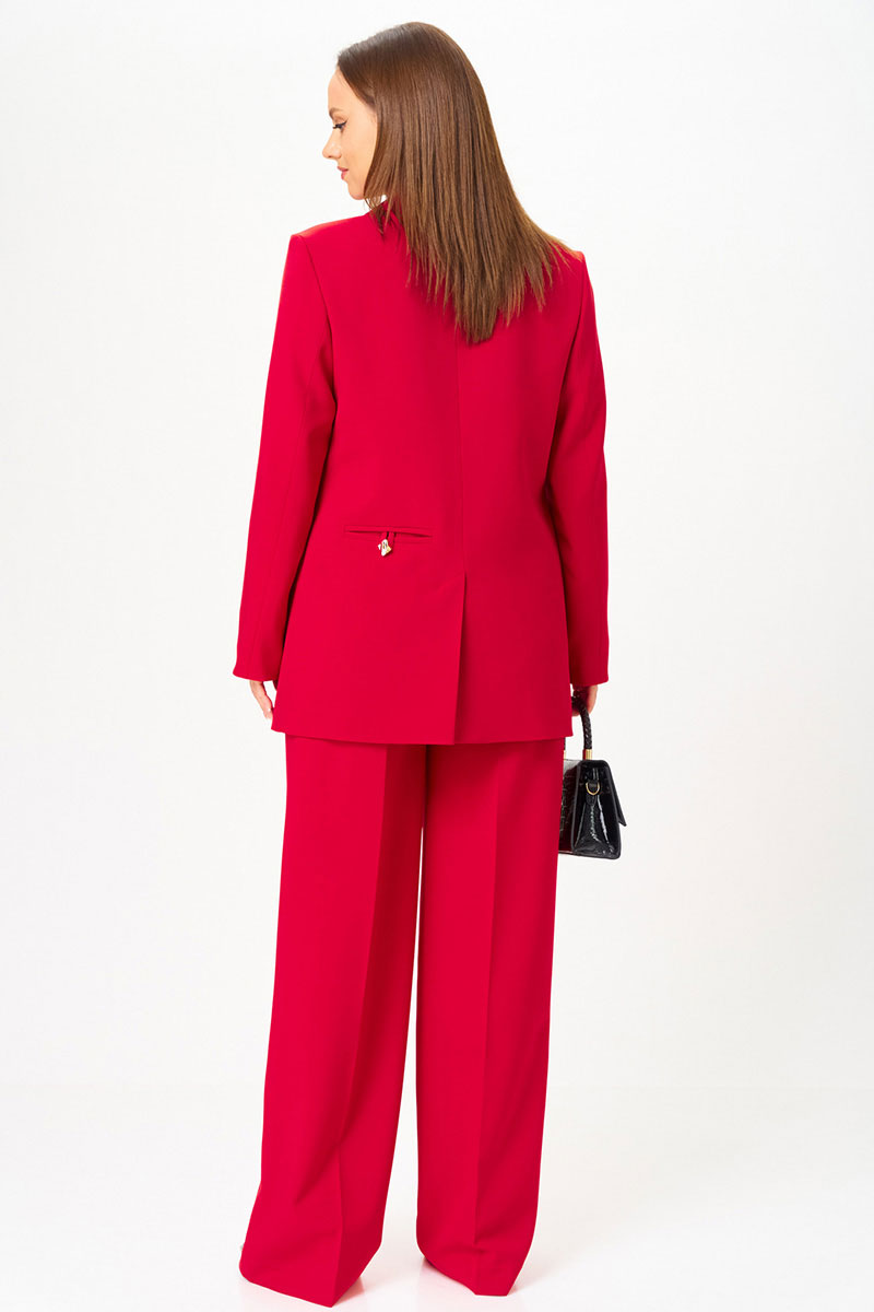 Костюм женский 2-х предметный, состоящий из жакета и брюк. Жакет полуприлегающего силуэта, на подкладке, с одноботной застежкой на петли и пуговицы. Горловина жакета оформлена воротником пиджачного типа. В области бедер обработаны прорезные карманы "в рамку" с клапаном. Спинка жакета со средним швом, заканчивающийся шлицей, левая часть спинки с прорезным карманом в рамку, вход в который фиксирует навесная петля с пуговицей. Брюки формы "палаццо" со стрелками. Верхний срез обработан притачным поясом с резинкой в области спинки. По центру переда - застёжка на крючок и тесьму-молнию. В боковых швах расположены наклонные карманы.