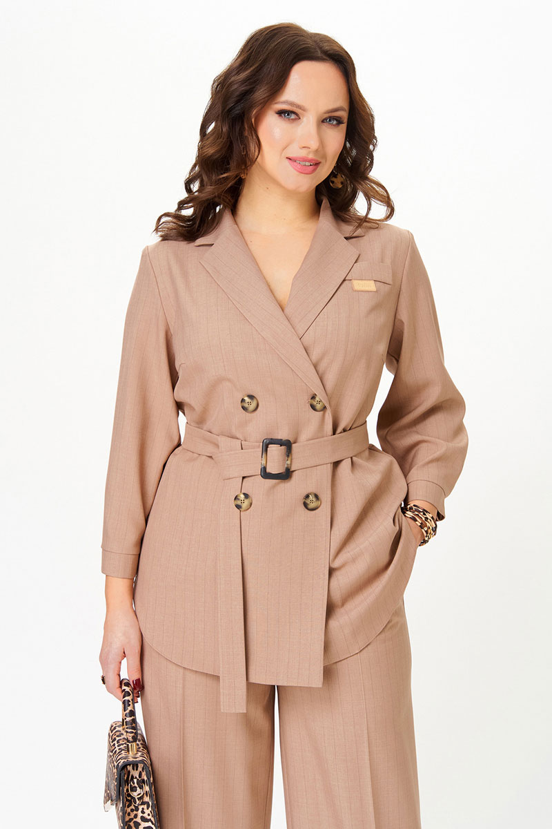 Костюм состоит из жакета и брюк. Качественная ткань лен-вишер, из которой выполнена модель, обеспечит долговечность изделию и приятные ощущения его обладательнице.