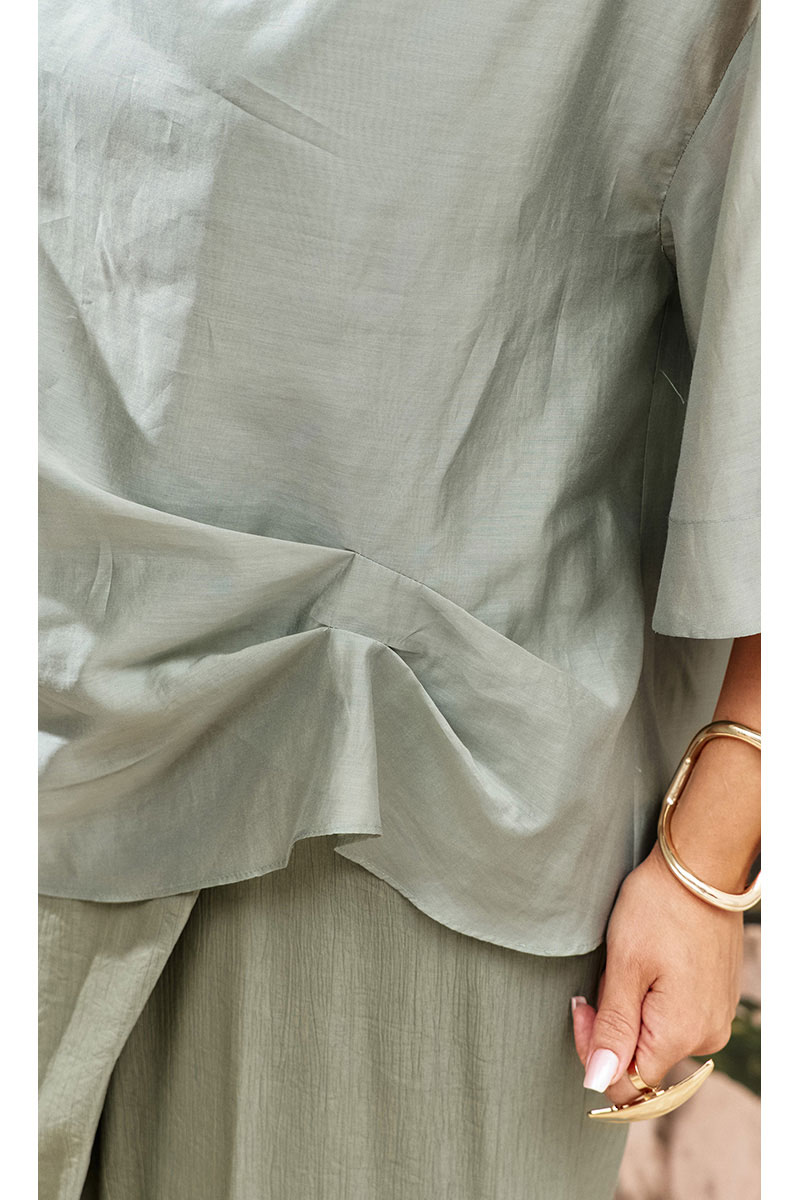 Блуза свободного кроя, с горловиной «лодочка». Рукава втачные, длиной чуть ниже локтя, со спущенной линией плеча. Блуза по переду декорирована защипами, создающими эффект асимметрии. Перед блузы двухслойный. В боковых швах – разрезы.