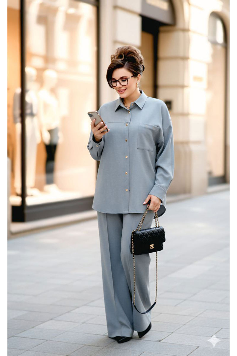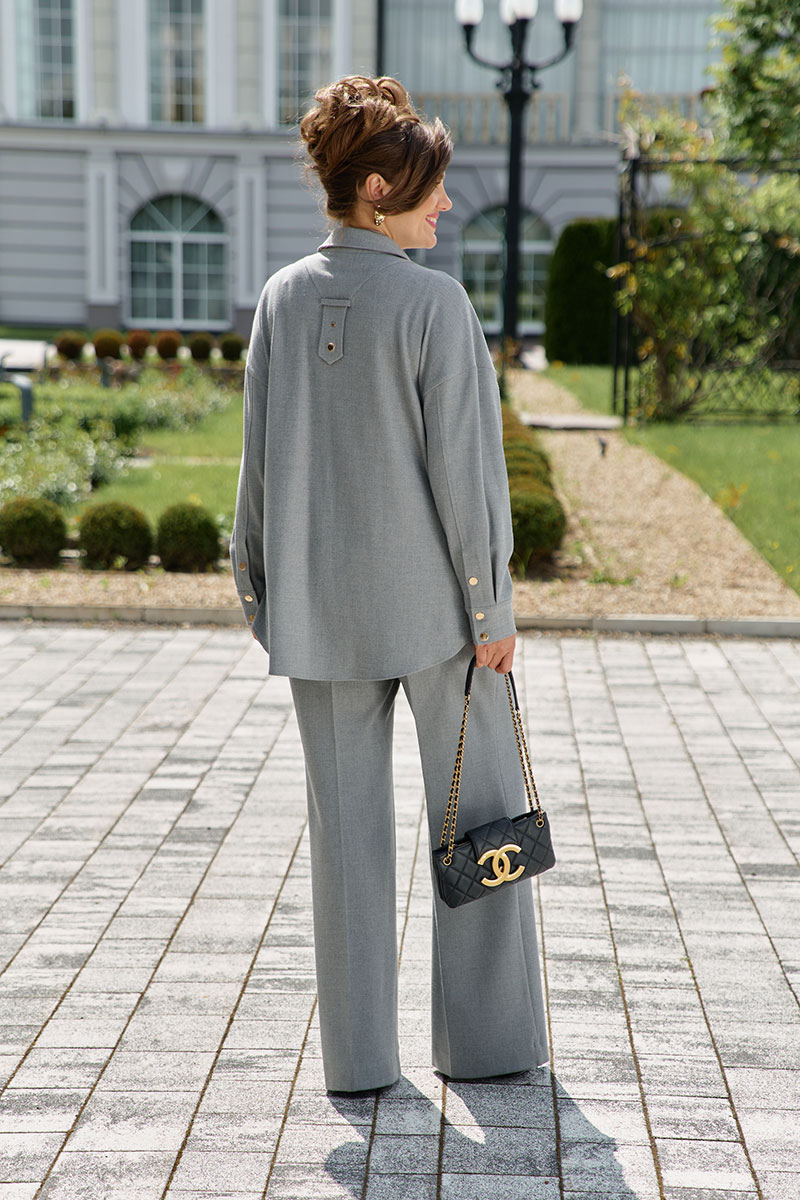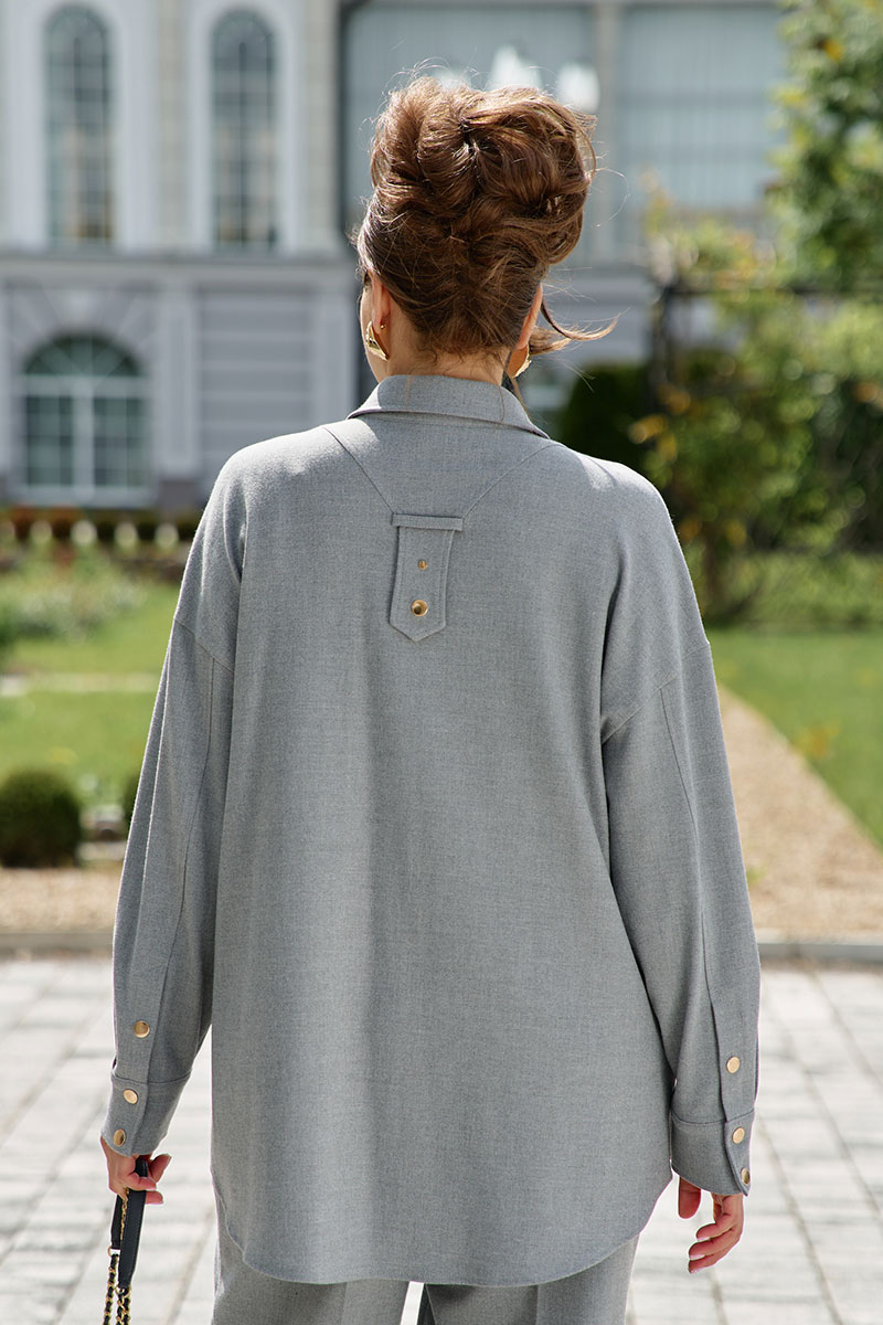 Рубашка «оверсайз» свободно ниспадает с плеч, её мягкие формы подчёркивают лёгкую небрежность, но не лишены чёткости линий. По переду центральная застёжка на декоративные кнопки по планке, воротник рубашечного типа. По правой детали переда отрезная кокетка, по левой накладной карман с отделочным декоративным элементом в виде хольнитен от верха кармана. Спинка с декоративным элементом в виде притачной вставки переходящей в отлетной хлястик с отделочной шлёвкой. В качестве дополнительной отделки декоративные кнопки и хольнитены и кнопки по хлястику. Линия плеча в рубашке спущенная. Рукав втачной, длинный с заложенной складкой по низу и притачной манжетой с застёжкой на декоративные функциональные кнопки. Низ в рубашке фигурной формы. В боковых швах от низа разрезы.