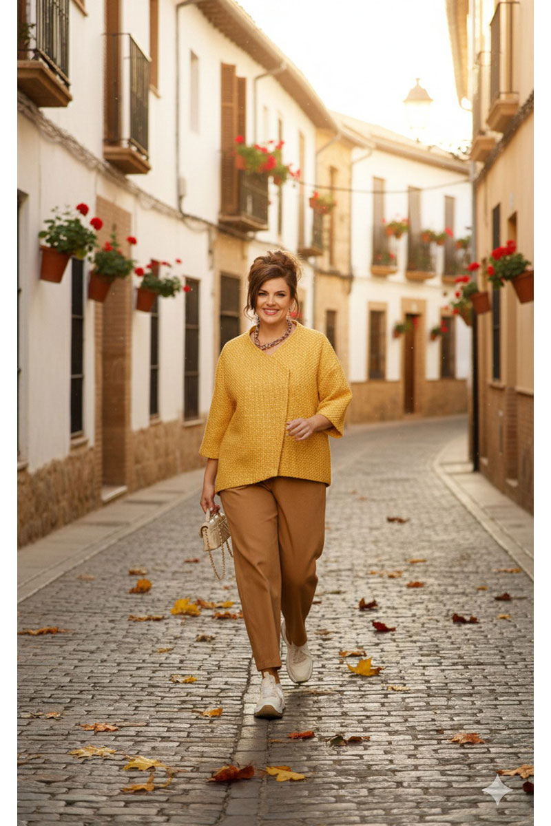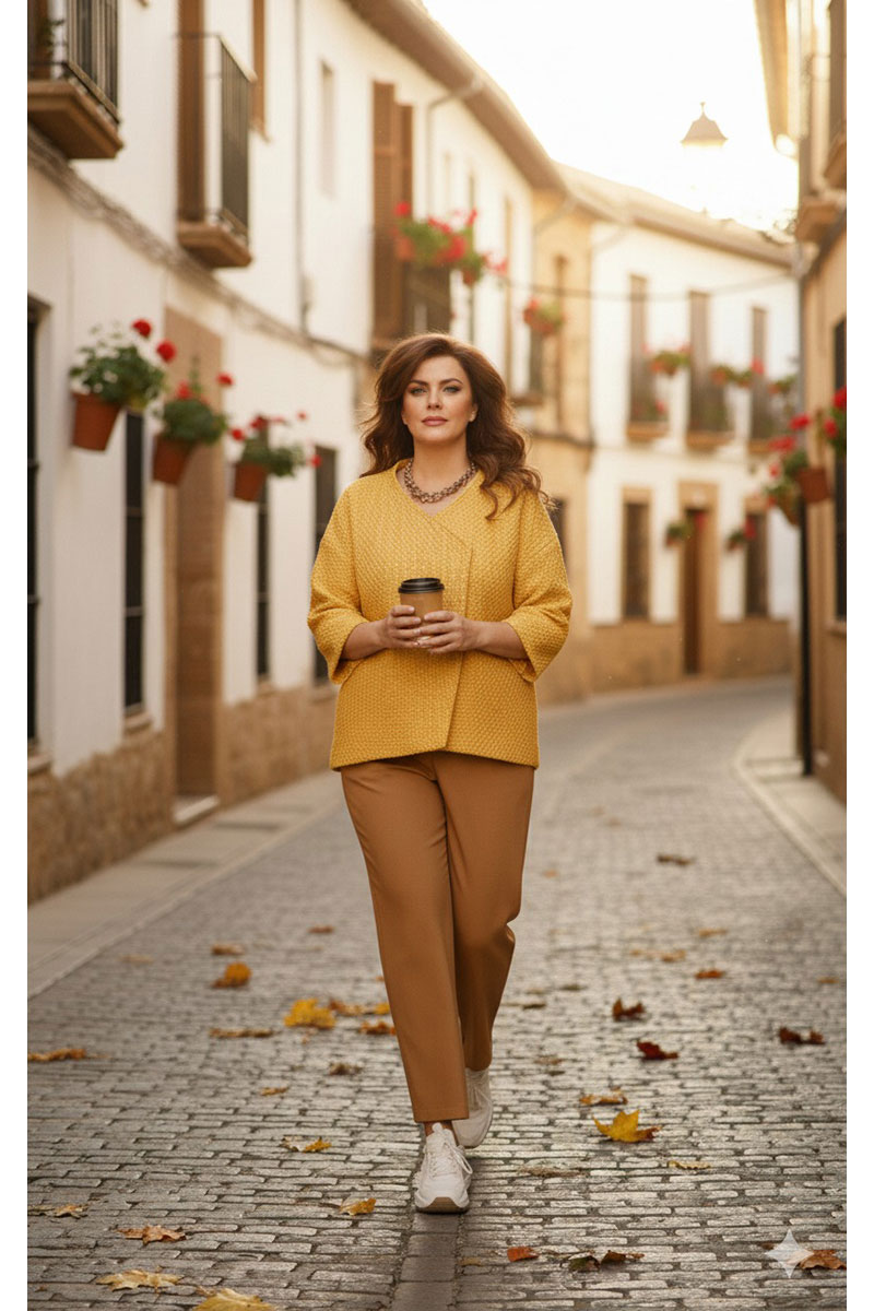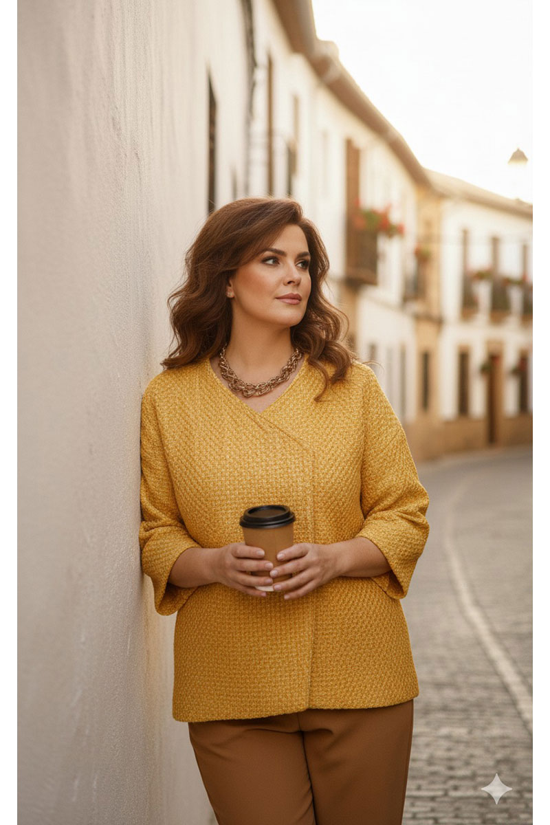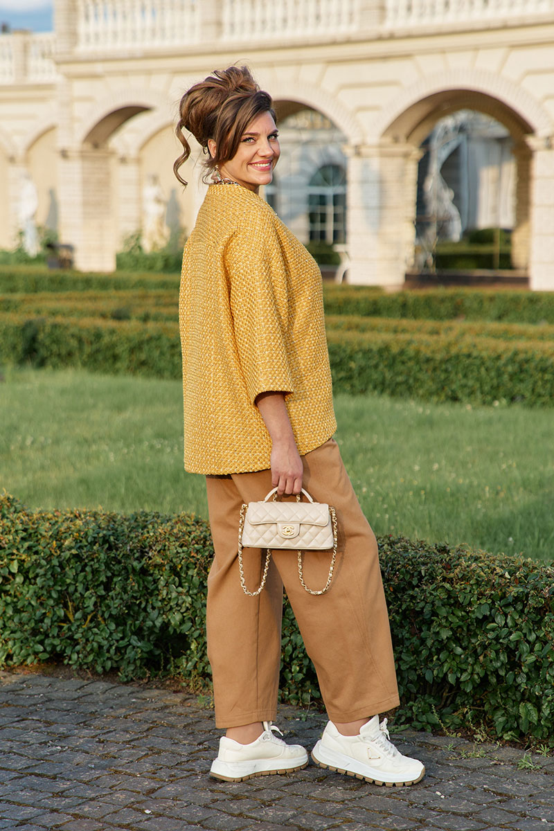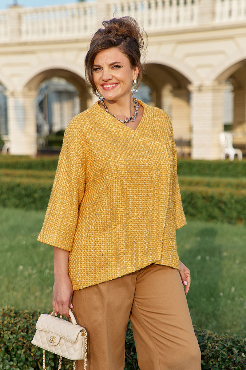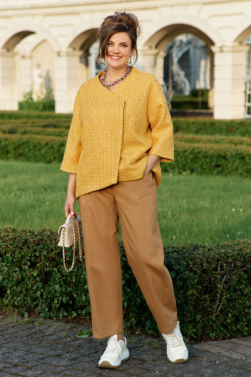 Жакет прямого силуэта, с двубортной, косой потайной застёжкой по борту, на 3 пришивные пуговицы.По правой полочке отрезная планка, по низу переда подрез с карманом и косой нагрудной выточкой. Линия плеча спущена, горловина V-образная. Спинка с кокеткой и вертикальными рельефами. Рукав втачной одношовный, длина 3/4 . Жакет на подкладке.