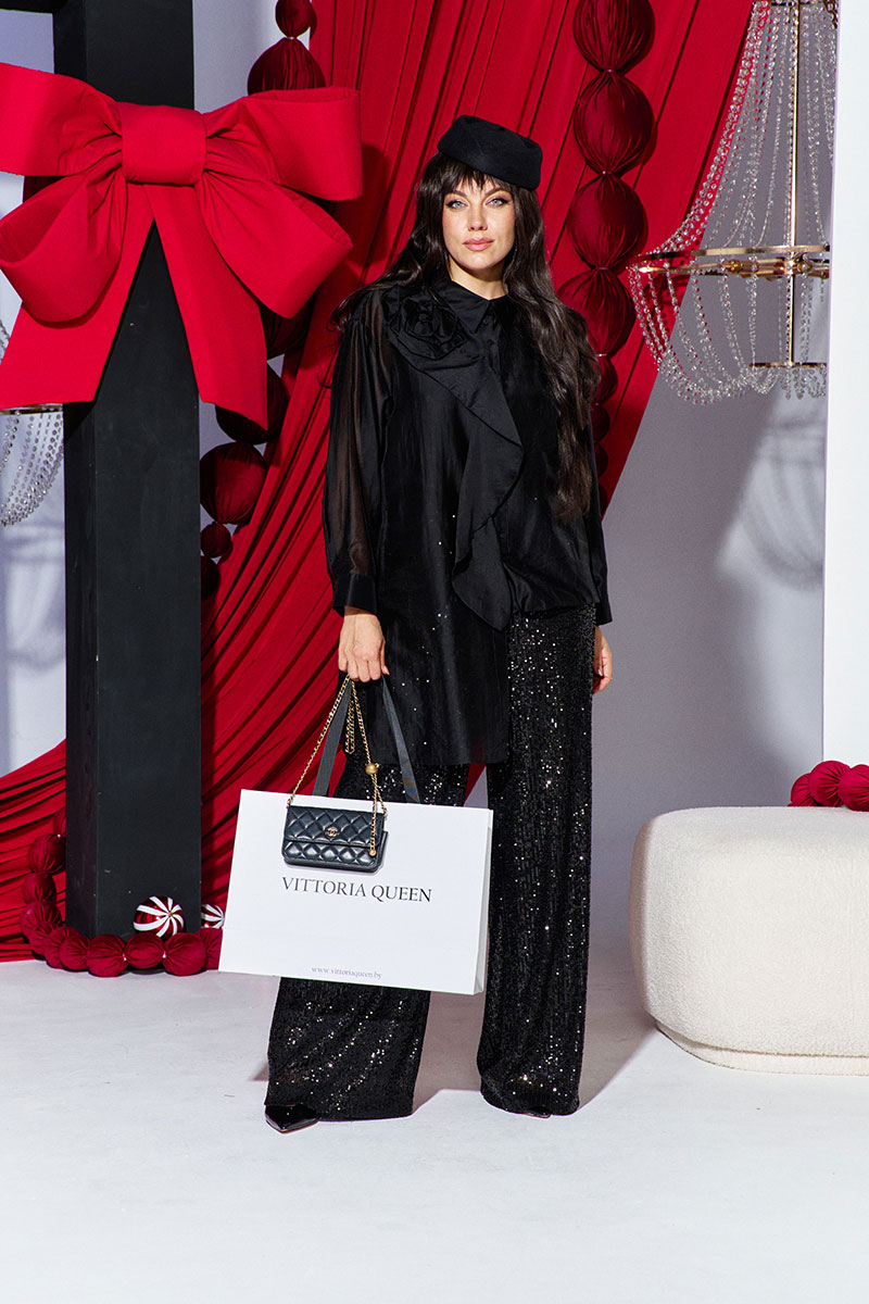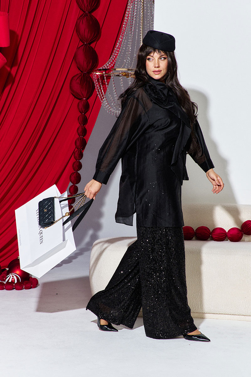 Комплект женский боючный, состоящий из блузки, блузы и брюк. Это нарядный и стильный комплект, который идеально подходит для вечернего мероприятия. Брюки выполнены из плотной ткани, полностью расшитой чёрными пайетками, которые создают эффект яркого мерцания при движении. Их свободный крой и высокая посадка на талии обеспечивают комфорт и создают современный, элегантный силуэт. Блузка из полупрозрачной чёрной вуали имеет свободный, струящийся крой. Её главным акцентом является крупный объёмный цветок, расположенный на плече, и декоративная драпировка. Под блузкой надет топ чёрного цвета, который скрывает тело и придаёт образу завершённость. Блузка (состав: 83% вискоза, 17% полиэстер) свободного силуэта, с центральной застёжкой на петли-пуговицы по планке, воротником рубашечного типа. Линия плеча в блузке спущенная. Рукав втачной, длинный с заложенной складкой по низу и притачной манжетой, застёгивающейся на петли-пуговицы. Спинка с отрезной кокеткой. Низа в блузке ассиметричный, в боковом шве высокий разрез. Главным акцентом является декоративный элемент в виде розы.