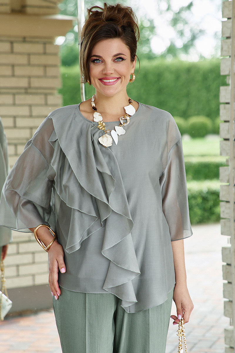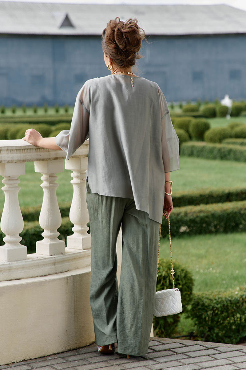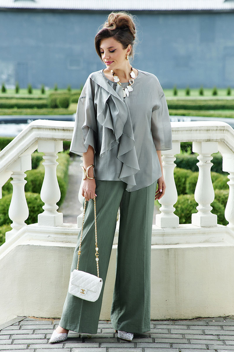 Вуалирующая прозрачность блузы, скрывает несовершенства фигуры, и создает идеальный силуэт, а брюки из ткани с «жатой» фактурой стройнят и вытягивают силуэт. Верхняя блуза свободного силуэта с округлой формой горловины. Линия плеча спущенная. Рукав втачной, длиной ¾ с декоративным защипом. Спинка без особенностей. Низ в блузе ассиметричный с разрезами в боковых швах. Главным акцентом блузы являются отделочные вставки в подрезе в виде рюш.