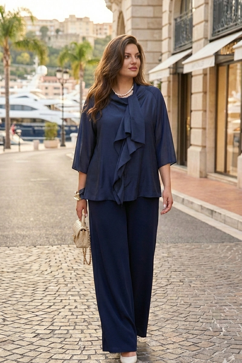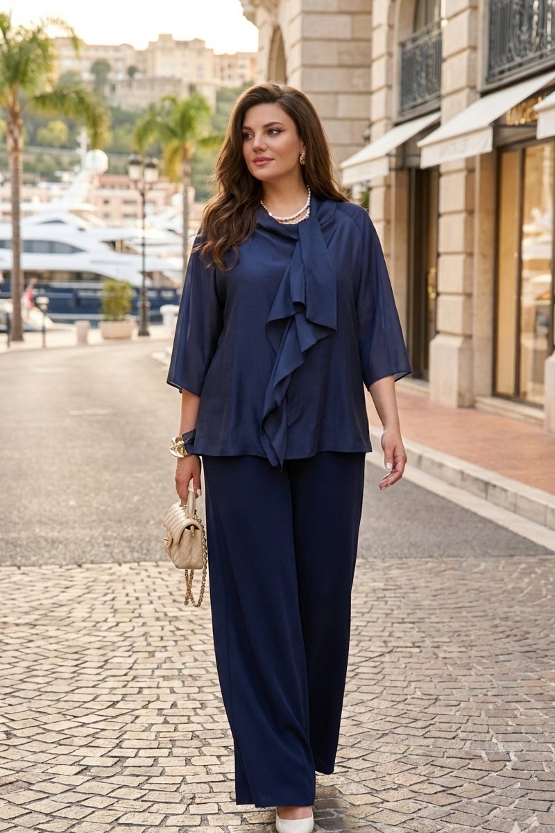 Брюки с высокой посадкой и струящимся кроем визуально удлиняют ноги, создавая безупречный и гармоничный ансамбль. Этот костюм идеально подходит как для торжественных мероприятий, так и для деловых встреч, подчеркивая ваш безупречный вкус и чувство стиля.