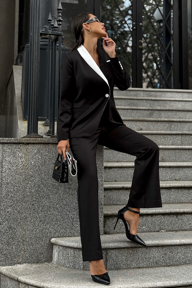 Элегантный черный брючный костюм URS — воплощение женственности, уверенности и безупречного вкуса. Этот женский брючный костюм создан для современных женщин, которые ценят классику, элегантность и комфорт в каждом движении. Стильный контраст черного и белого придает образу благородную строгость и подчеркивает индивидуальность, создавая гармоничное сочетание делового и утонченного стиля. Костюм женский ЮРС, нарядный, состоит из жакета и брюк, выполнен из костюмно - плательной ткани. костюмно-плательной ткани.