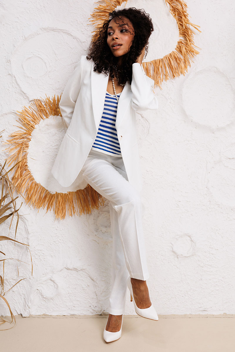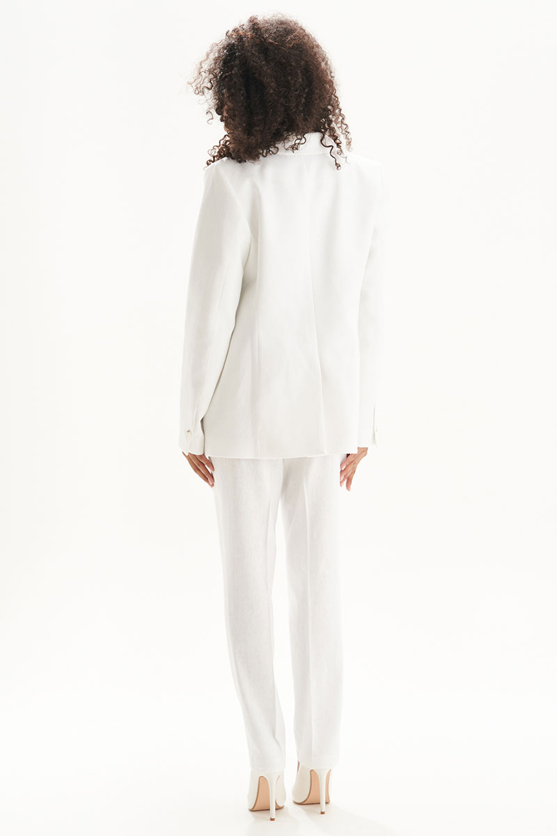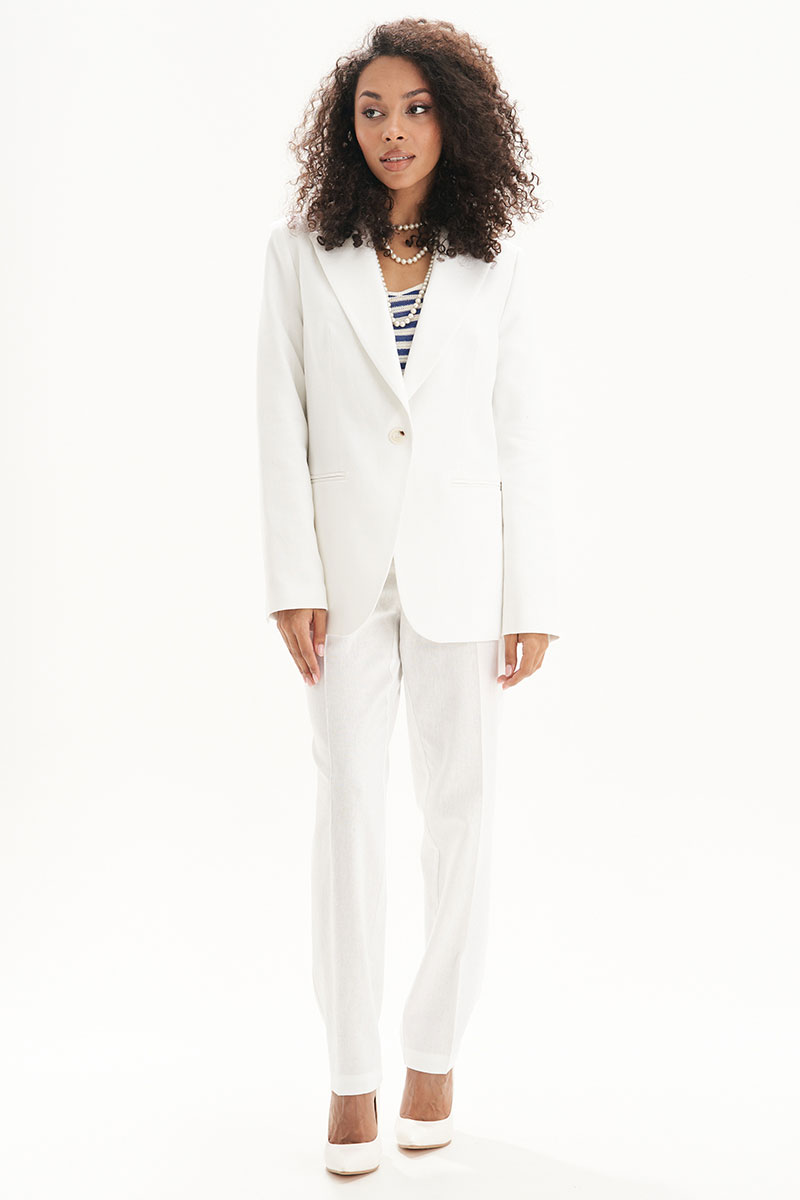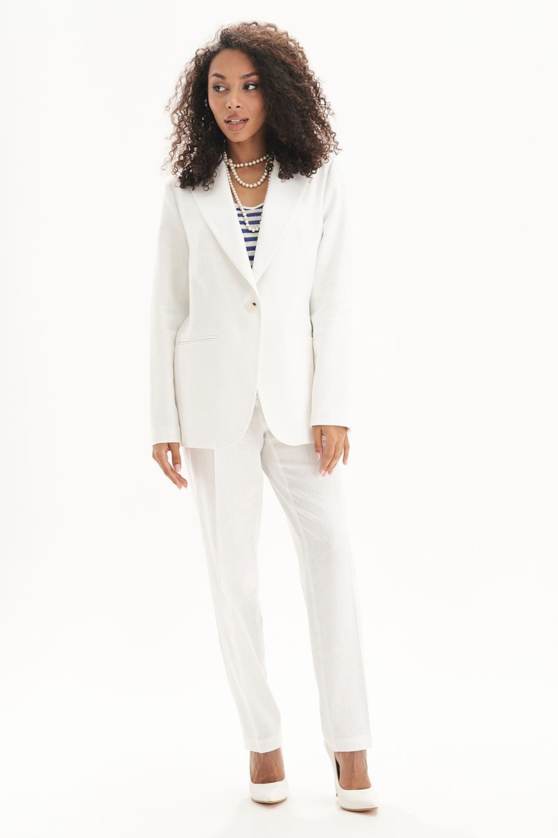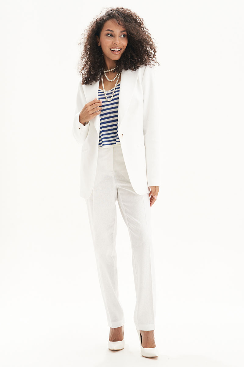Льняной женский костюм — это базовая вещь в гардеробе для тёплого сезона. Стильный и универсальный комплект из натурального льна включает прямые белые брюки и удлинённый жакет с аккуратным воротником и застёжкой на пуговицу. Модель подчёркивает силуэт, при этом оставаясь максимально комфортной за счёт дышащей, натуральной ткани.