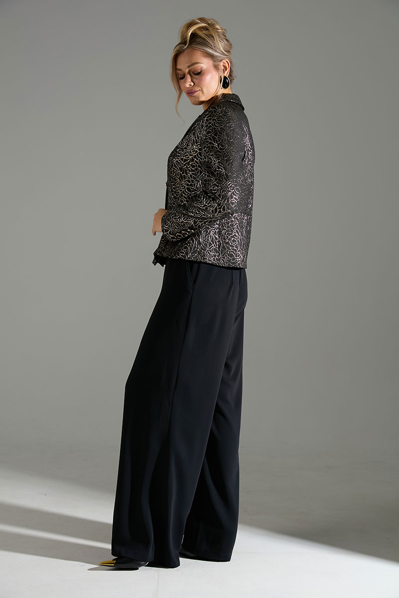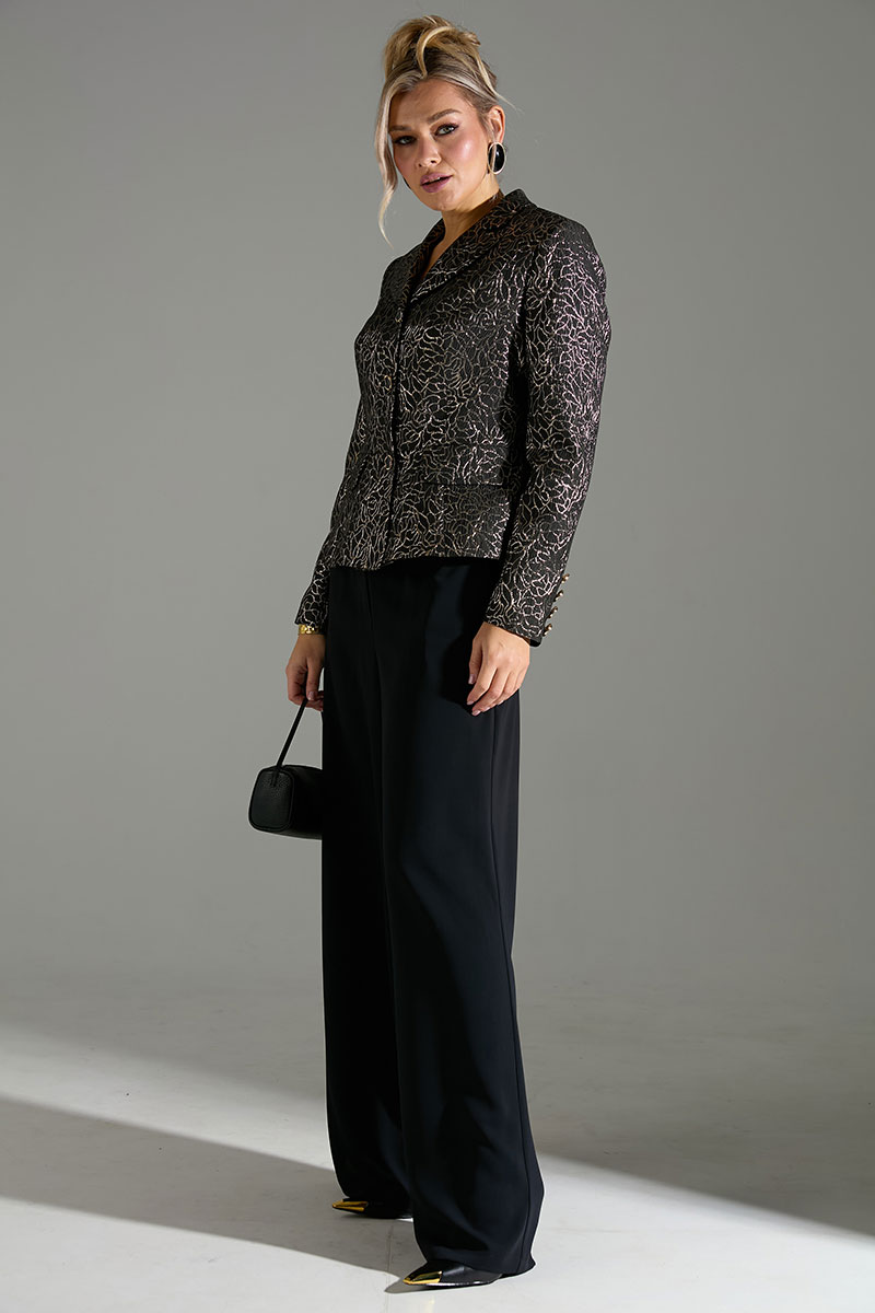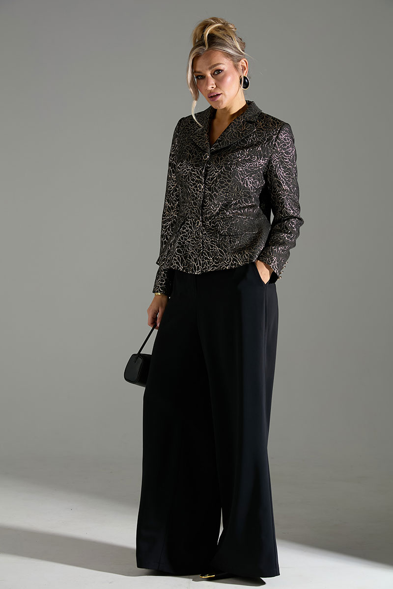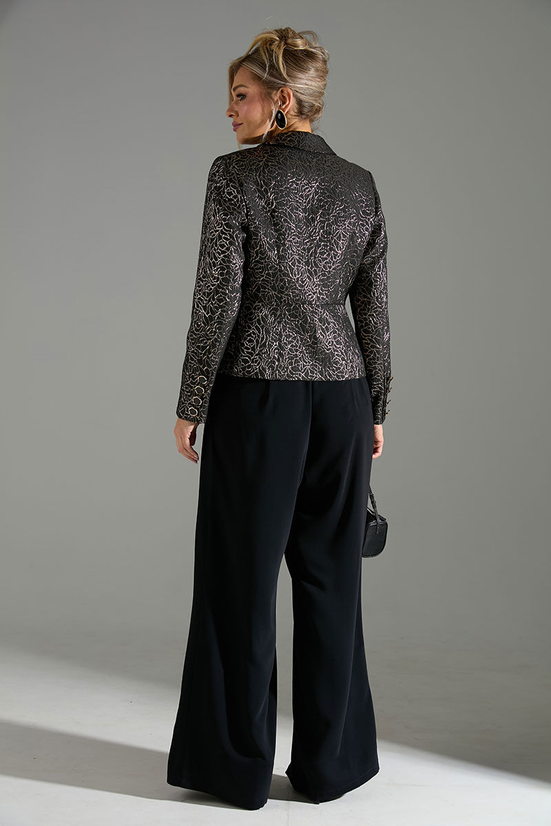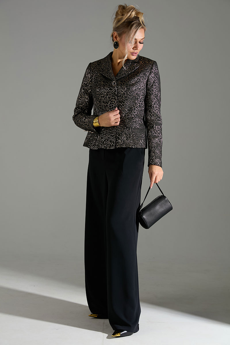 Комплект 2-ка, состоящий из жакета и брюк. Укороченный однобортный жакет приталенного силуэта с отложным воротником и лацканом. Жакет с отрезной линией талии и слегка расширенной баской. Застёжка на петли и пуговицы. По переду имитация карманов с клапанами. Рукава с имитацией шлицы с петлями и пуговицами. Брюки широкого объема, прямого силуэта. В боковых швах расположены карманы. Застежка-гульфик. Пояс отрезной, притачной. В задней части пояса вставлена эластичная тесьма (резинка). Пояс застегивается на петлю и крючок.