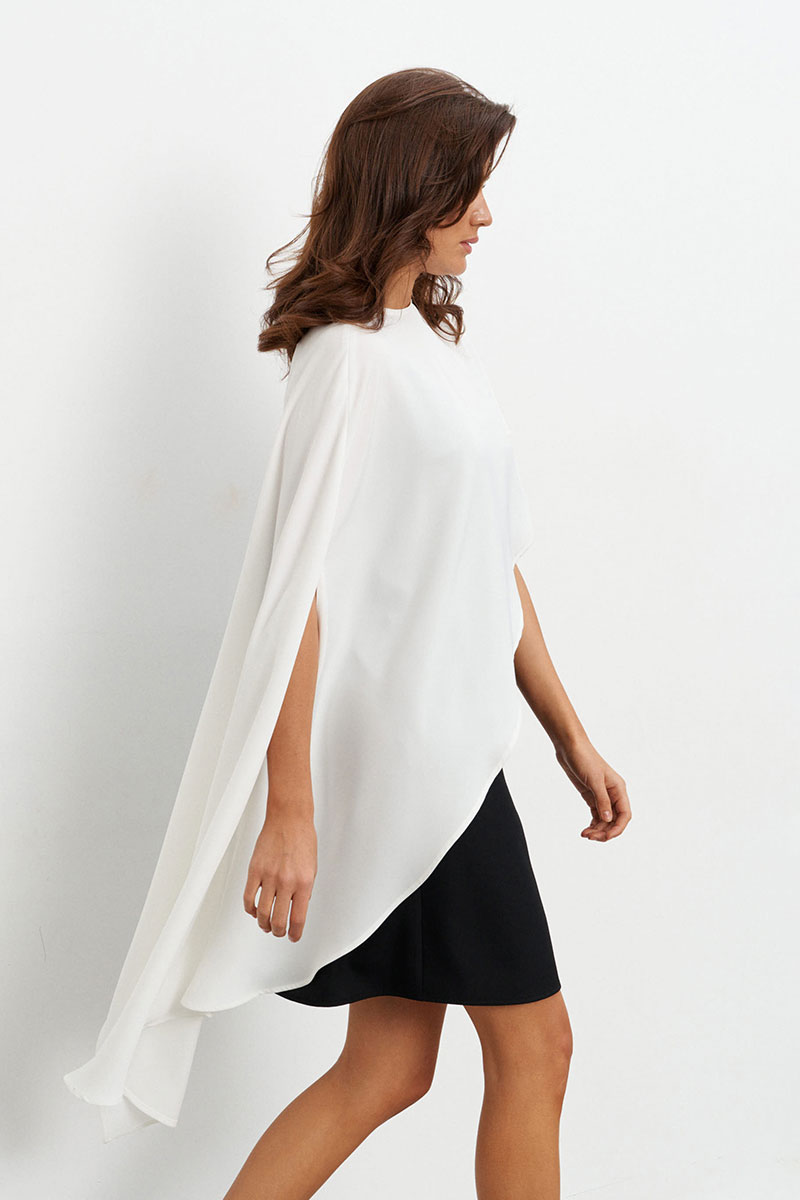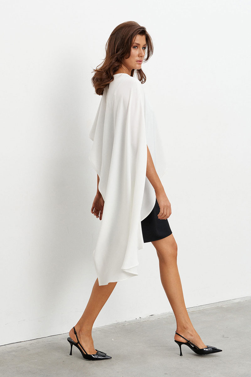 Блузка из струящейся ткани по форме напоминает кейп. Левая сторона короче и спадает с плеча, а правая - длинная с прорезью для руки. Сзади по горловине застёжка на пуговицу.