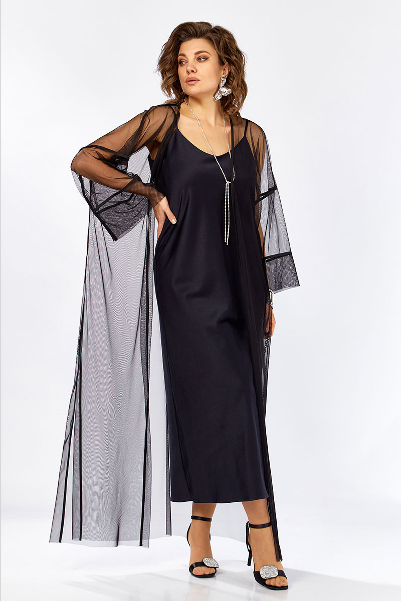 Изысканный комплект сочетает в себе платье из плотного атласа, свободного А-образного силуэта, на тонких бретелях и воздушную кардиган-шазюбль из сетки, создавая образ утончённой элегантности женственности. Это идеальный выбор для вечерних мероприятий, когда хочется выглядеть выразительно, но сдержанно и благородно.