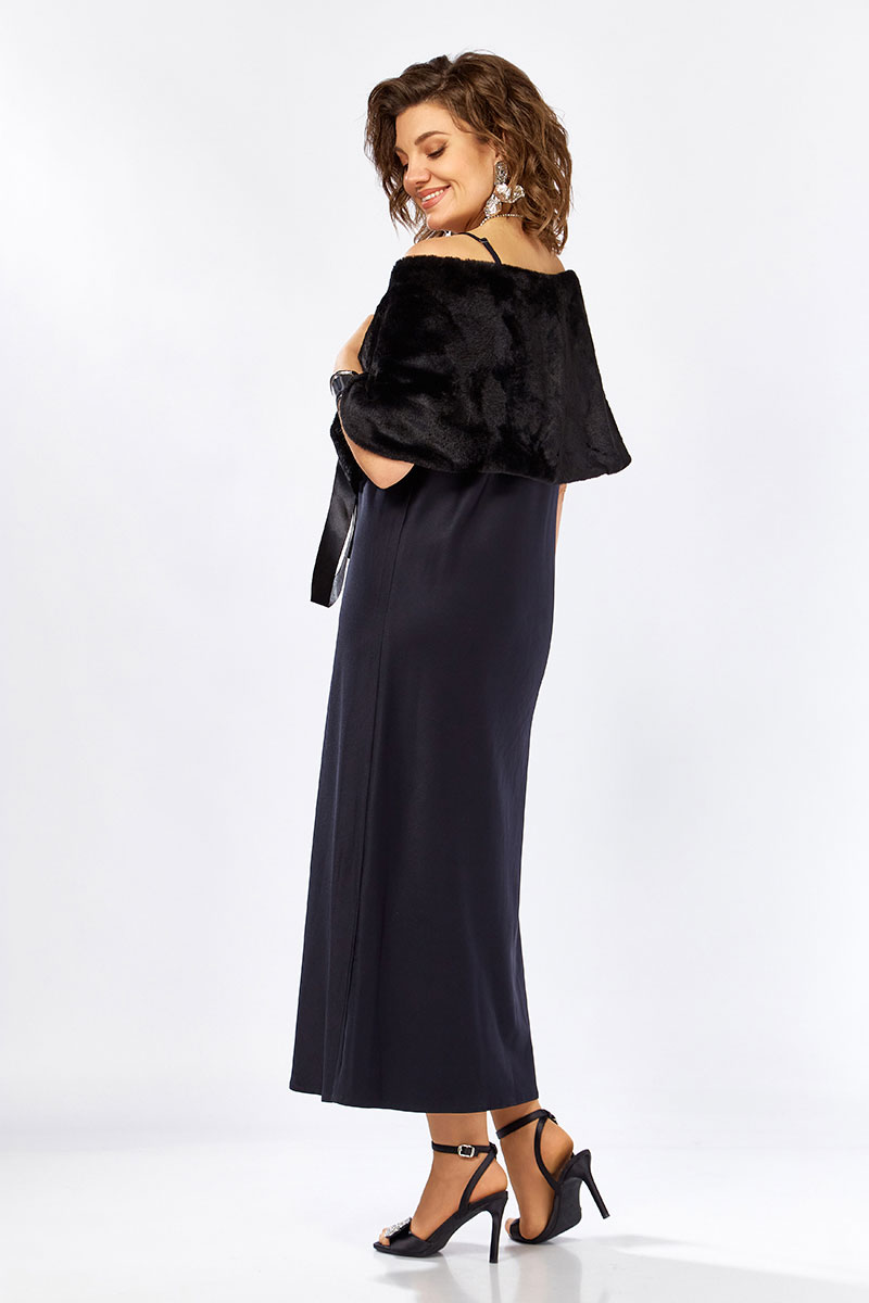 Изысканный комплект сочетает в себе платье из плотного атласа, свободного А-образного силуэта, изящной меховой горжеткой, создавая образ утончённой элегантности женственности.