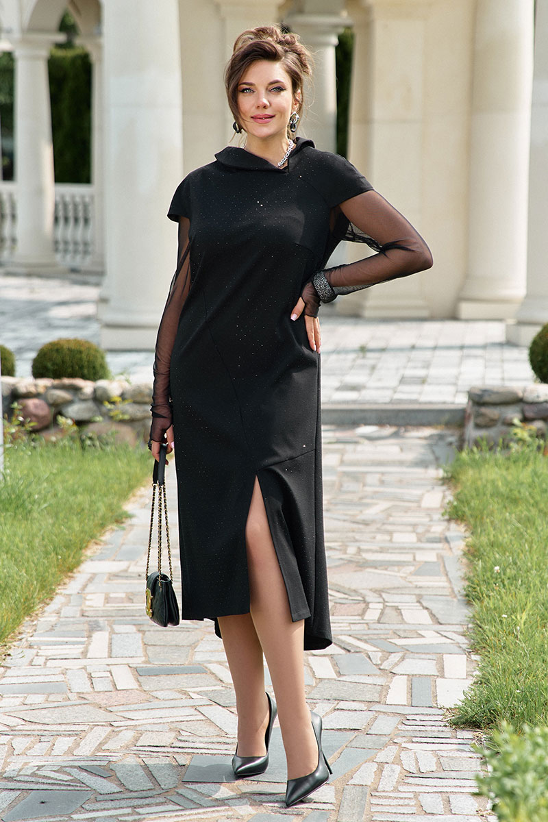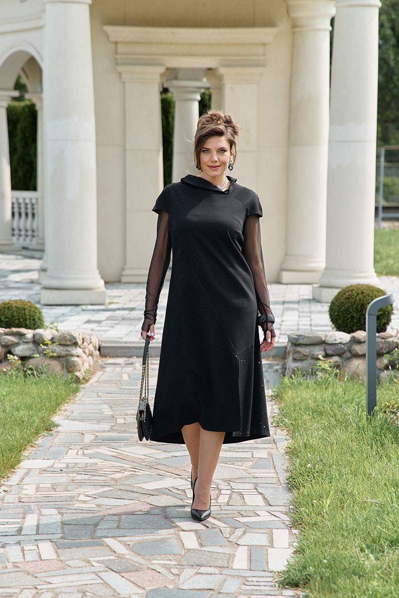 Комплект женский двух-предметный, состоящий из платья и блузона. Этот комплект — для женщины, которая не боится владеть вниманием. Если Вы ищете идеальное сочетание стиля и комфорта, вот идеальный выбор. Глубокий матовый чёрный трикотаж мягко струится, переливаясь при движении мелкими искорками страз.