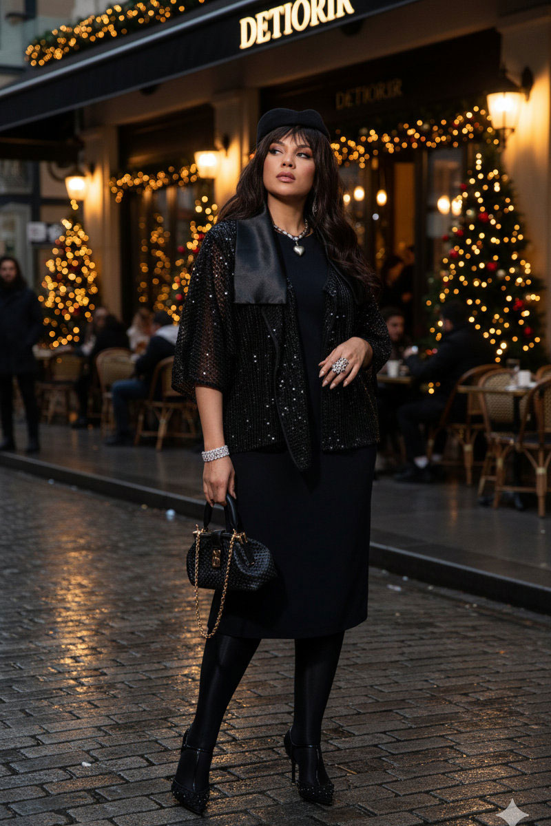 Комплект женский, состоящий из жакета и платья. Если Вы ищете идеальное сочетание стиля и комфорта, вот идеальный выбор. Мы специально подобрали качественную и тактильно приятную ткань, которая хорошо держит свою форму, создавая ощущение легкости и свободы движения. Стильный комплект - лучший выбор для тех, кто не боится самовыражаться и приковывать к себе взгляды окружающих. Жакет оверсайз жакет из чёрной сетки с мерцающей пайеткой и отложной атласный воротник, дополненный чёрным платьем-футляр. Жакет держится свободной линией на плечах, опускаясь до середины бедра. Сетка тонкая, полупрозрачная, но удерживает образ за счёт декоративной пайетки, которая мерцает точечными искрами. Пайетки распределены ровно и аккуратно, собирая свет в мелкие контуры по периметру каждого квадрата, создавая нежное, таинственное мерцание. Воротник ассиметричный, из гладкого атласа плавно ложится на плечи, добавляя комплекту строгий лоск и контраст матовой сетке. Его поверхность отражает свет иначе, чем сетка, подчеркивая линию шеи и проглядывая лоском на контрастной глубине ткани. Жакет с ассиметричной линией борта, отложным воротником из отделочной ткани. Линия плеча в жакете спущенная. Рукав втачной, длиной ¾. Спинка без особенностей. Жакет на подкладке.