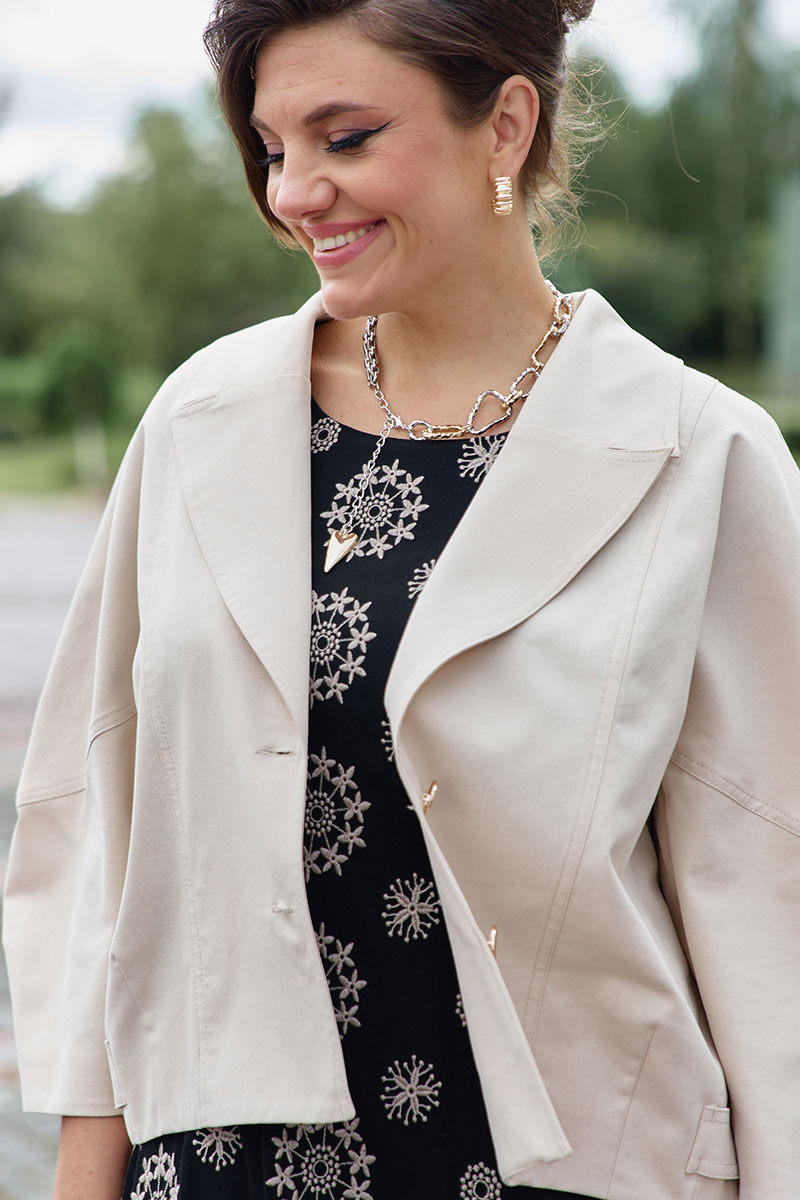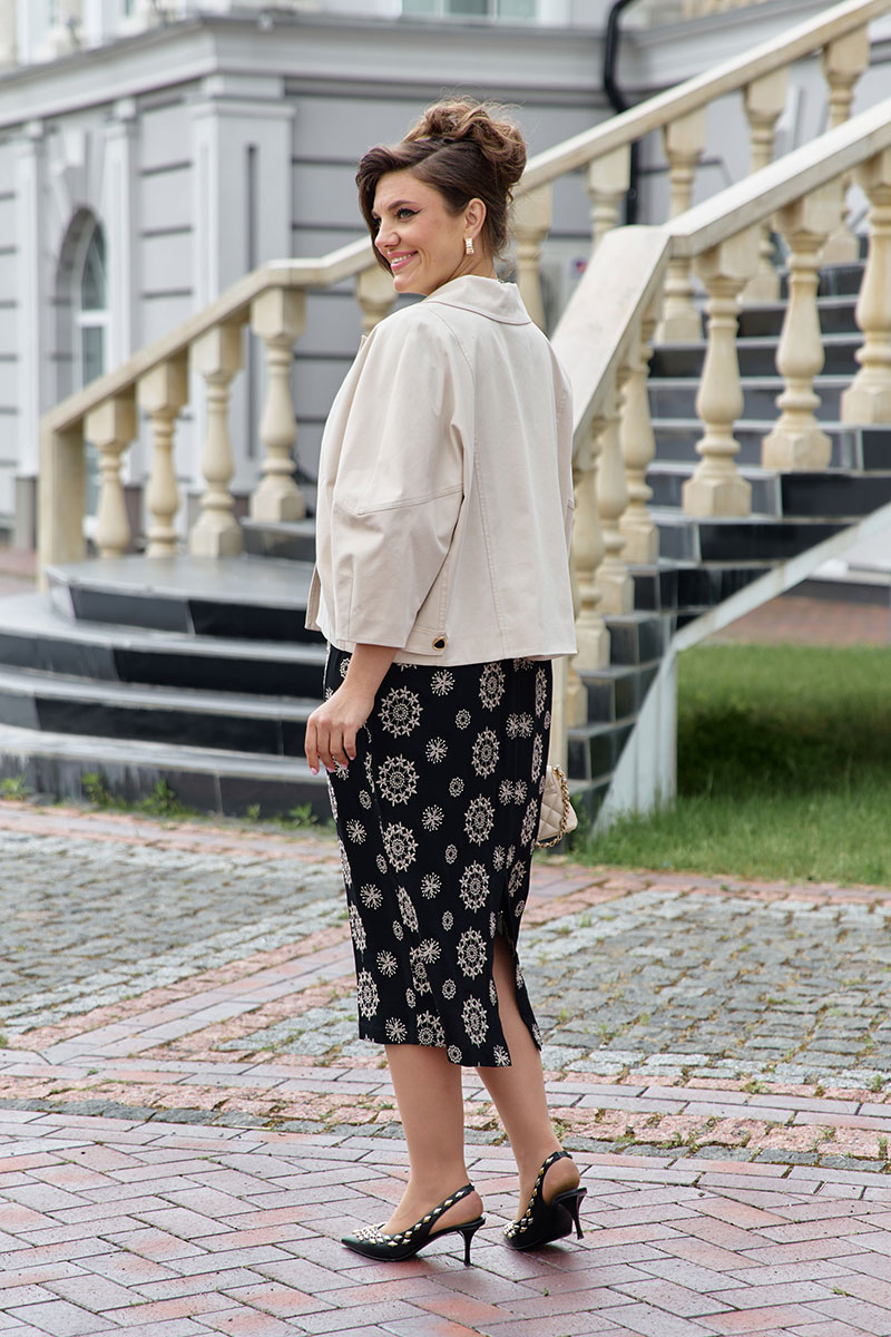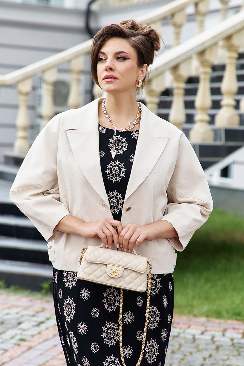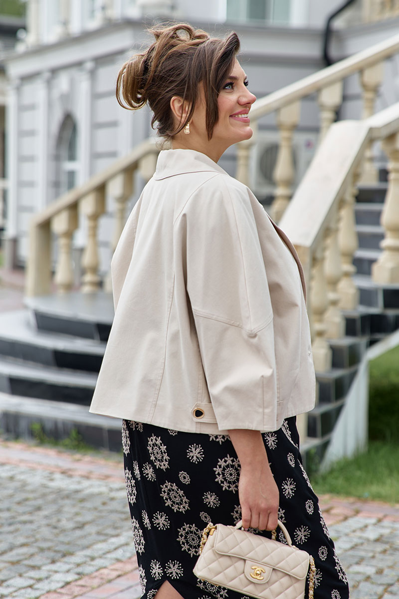 Жакет «оверсайз», укороченный, с центральной застёжкой на петли-пуговицы по краю борта, воротником пиджачного типа. Линия плеча спущенная с фигурной формой проймы. По переду жакета декоративные рельефы с отделкой в виде отстрочки ниткой в тон. От низа жакета по переду декоративные вытачки, в бочках, с переходом на спинку декоративный элемент в виде паты фиксирующейся при помощи шлёвки и декоративной пуговицы. Спинка в жакете с декоративными рельефами с отделкой в виде отстрочки ниткой в тон. Рукав длиной 7/8 с декоративной вытачкой от низа. Жакет без подкладки.