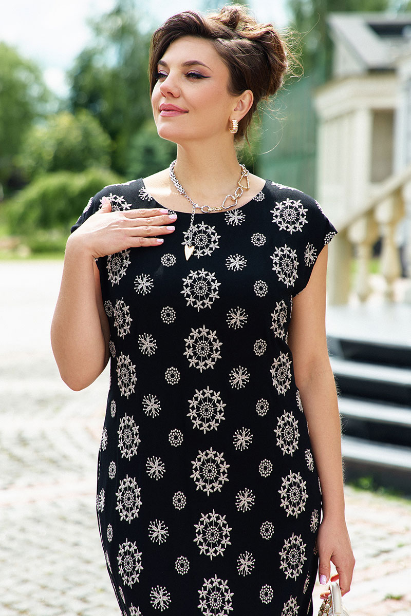 Платье полуприлегающего силуэта, горловина в платье округлой формы, линия плеча увеличена, по переду платья нагрудные вытачки. Спинка в платье со средним швом заканчивающимся высоким разрезом.