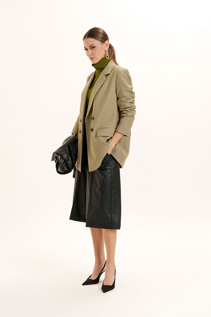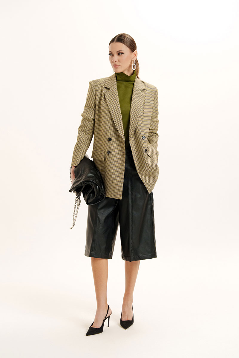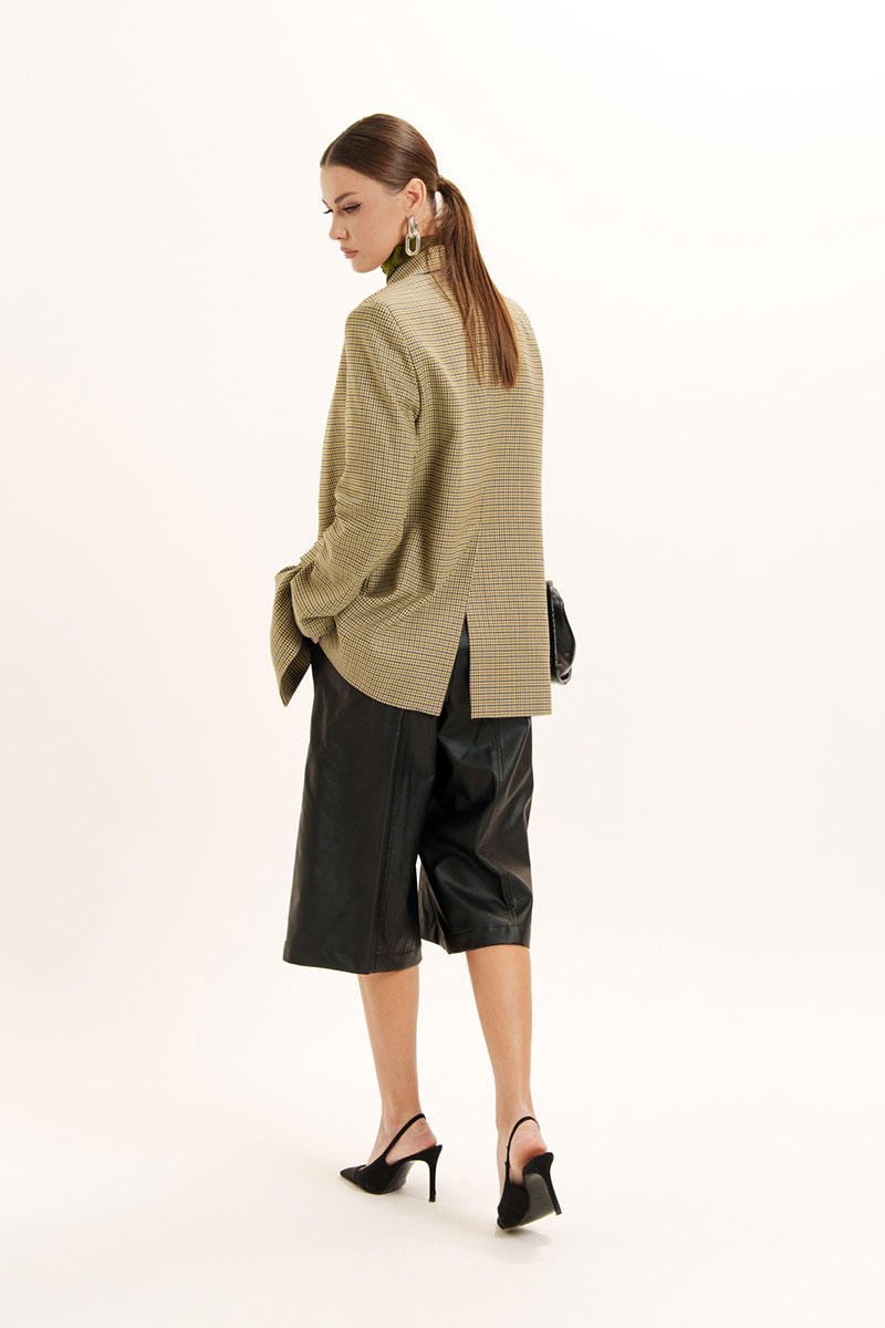 Шорты-бермуды из искусственной кожи на хлопковой основе. Пояс - отрезной с эластичной тесьмой и застежкой на брючный крючок. В боковых швах - карманы с отрезными бочками. Изделие декорировано вертикальными подрезами с отделочными строчками. Есть шлевки для ремня.