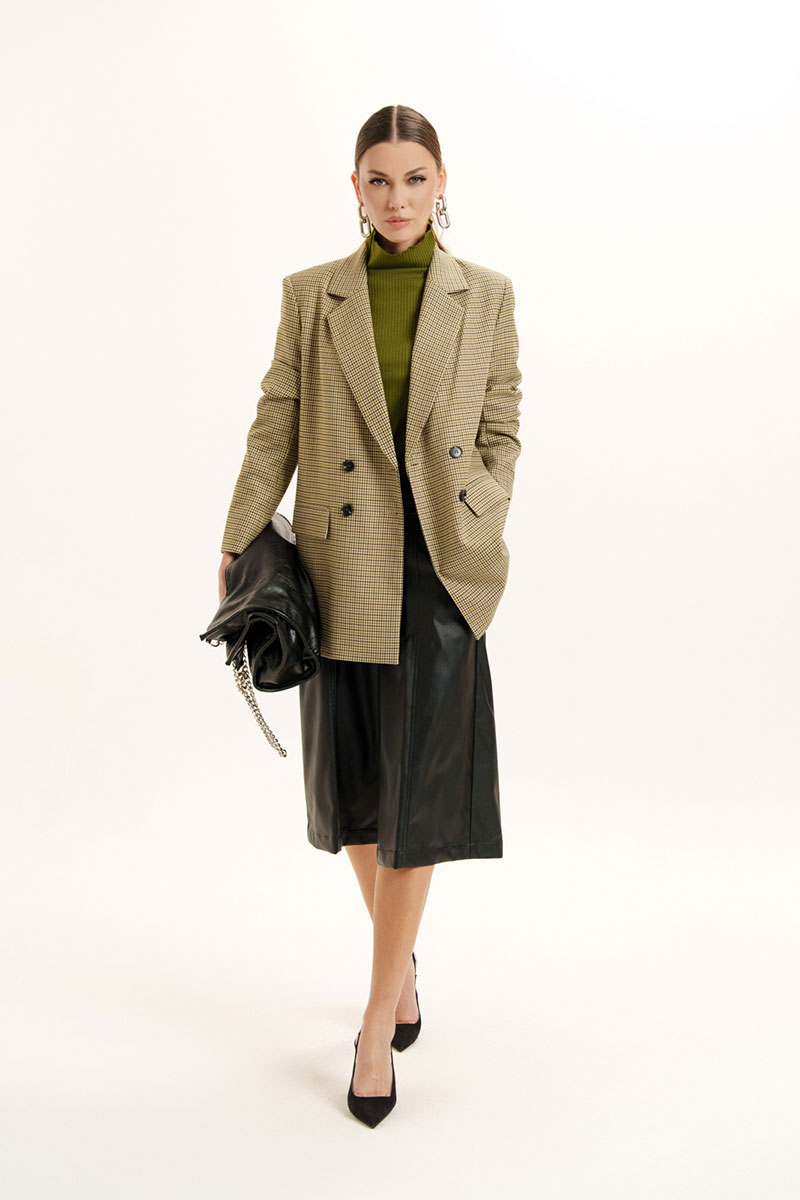 Жакет классического покроя из поливискозной ткани. Вырез горловины оформлен воротником пиджачного типа с двубортной застежкой на петли с пуговицами. Рукава - втачные, двухшовные. Линия плеч усилена плечевыми накладками. Спереди имеются прорезные карманы, сзади - шлица. Изделие посажено на подкладку.