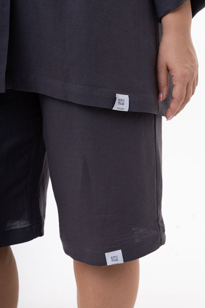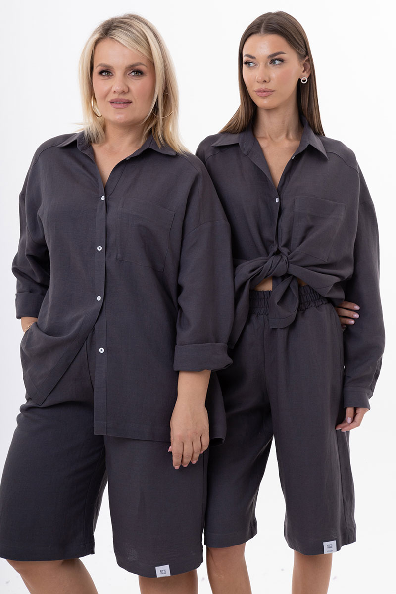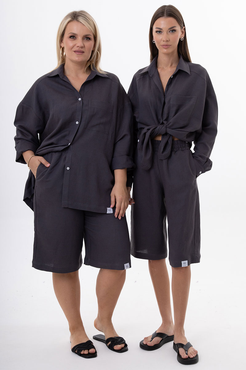 Блуза: Утонченный фасон с аккуратным воротником и натуральной текстурой льна подчеркивает женственность. Свободный крой и лаконичный дизайн делают ее идеальной парой для шорт, создавая гармоничный лук для города, отпуска или неформальных встреч.
