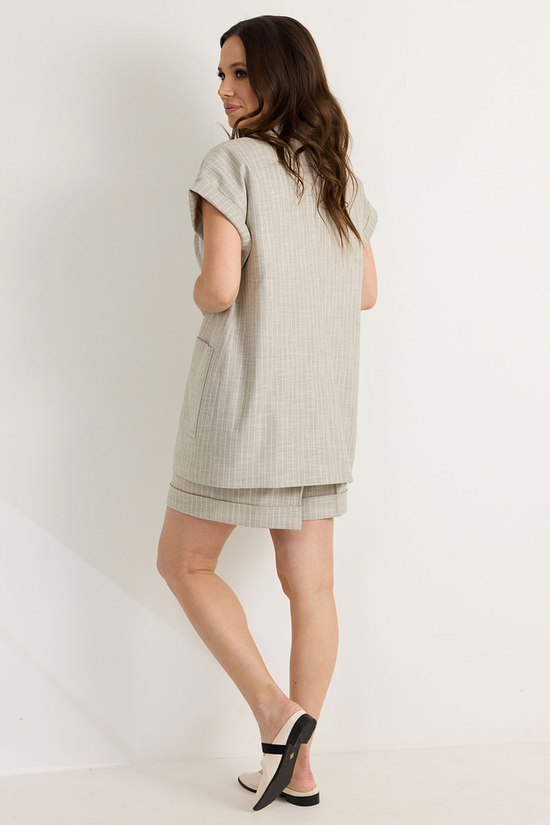 Стильный и лаконичный комплект из жилета и шорт. Выполнен из поливискозного полотна серо-бежевого цвета в меловую полоску.