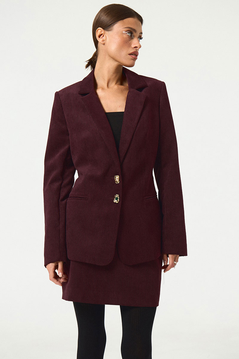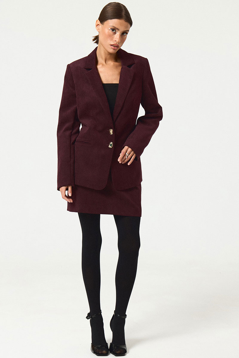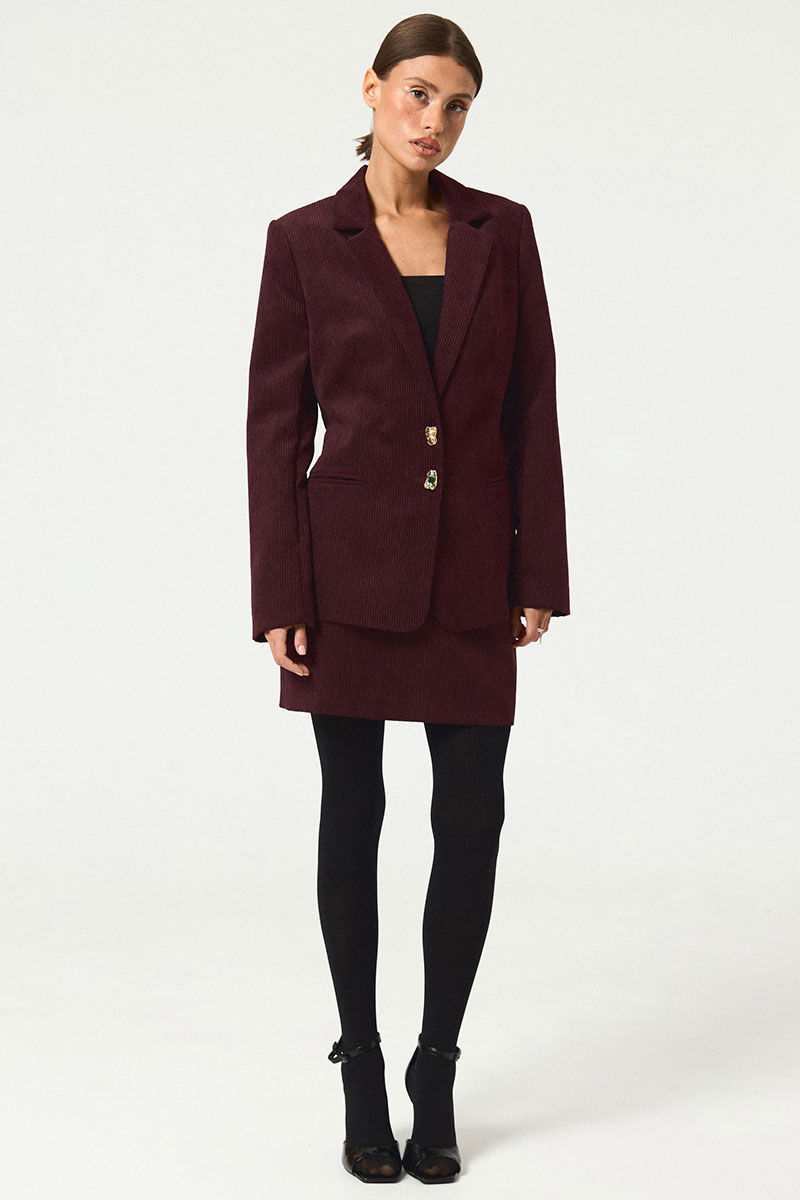 Жакет полуприлегающего силуэта, удлиненный. По переду функциональные карманы с обтачкой. Застежка на 2 пуговицы. Воротник с отложными лацканами, длинный рукав, на подкладке. Разрезов на спинке нет. Рельефы по переду и по спинке. Юбка в длине мини с застежкой на молнию.