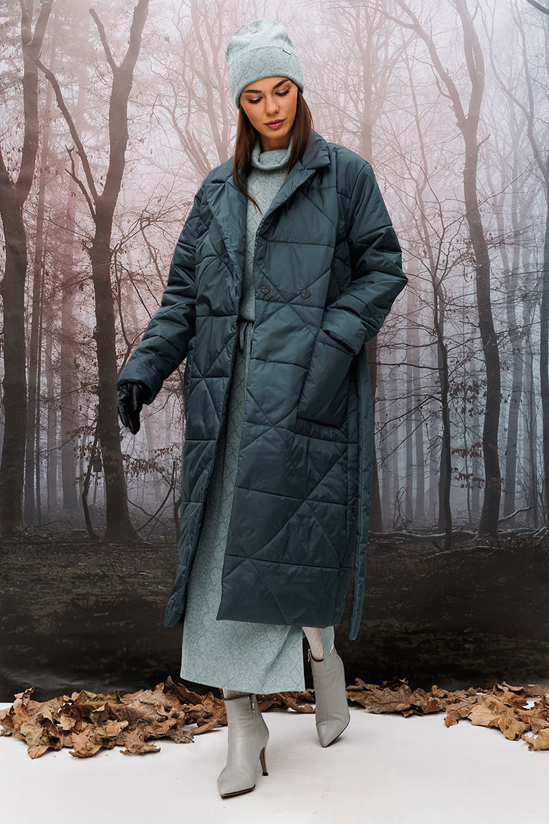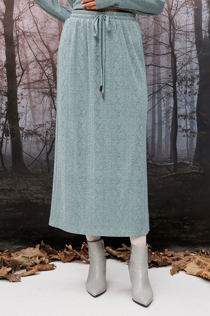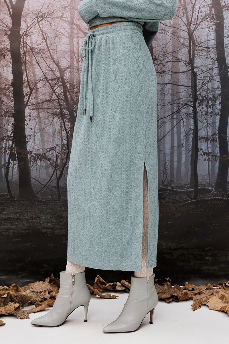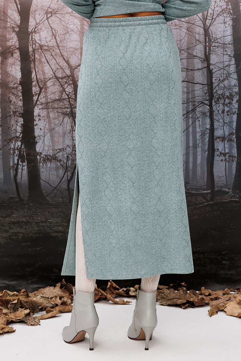 Юбка прямого силуэта на притачном отстроченном поясе на резинке и втянутым в него шнурком из основной ткани. По левому боковому шву внизу обработан разрез.