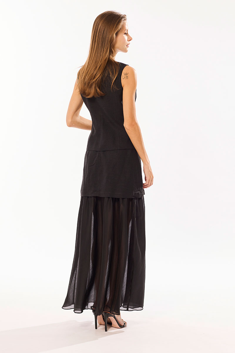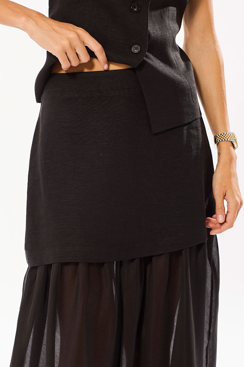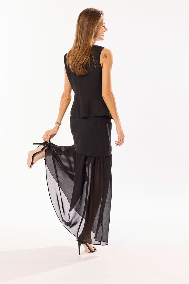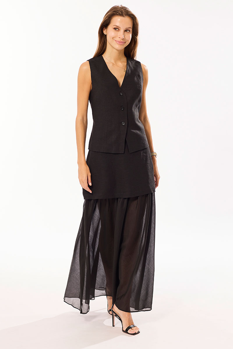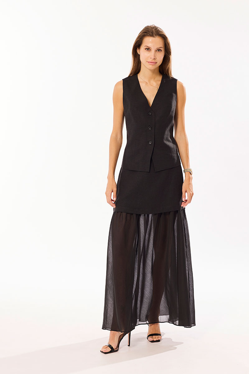 Комплект, состоящий из жилета и юбки. Комплект выполнен из смесового льна и вискозной вуали. Жилет и юбка на хлопковой подкладке, с притачной оборкой из вуали. Застежка в жилете центральная на петли и пуговицы. Верх юбки обработан подкройным поясом - обтачкой, застежка молния в среднем шве.
