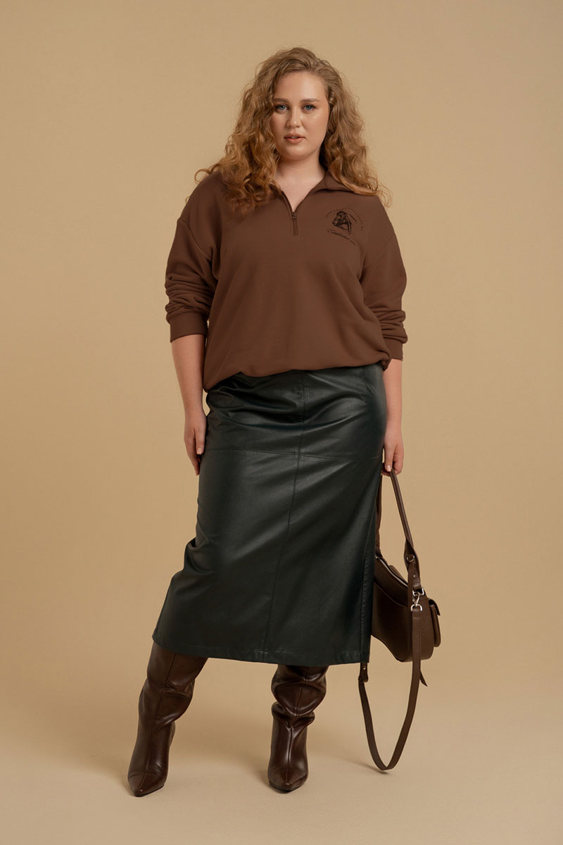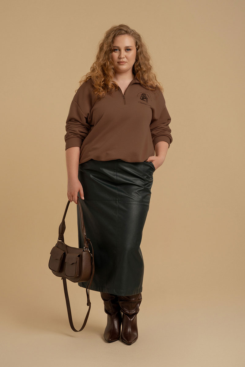 Свитшот из трикотажного полотна футер свободного покроя. Вырез горловины оформлен воротником - стойкой. Застежка- молния. Рукава - втачные со спущенной линией плеча.