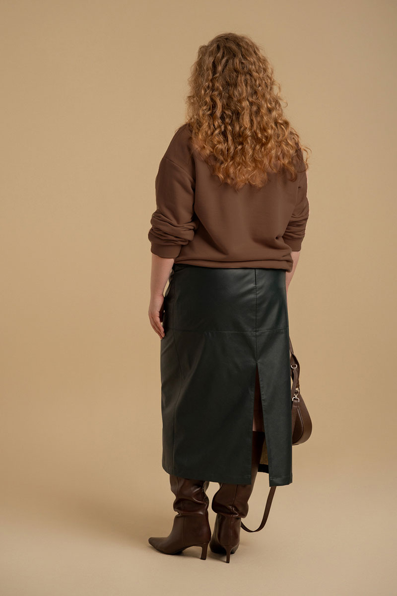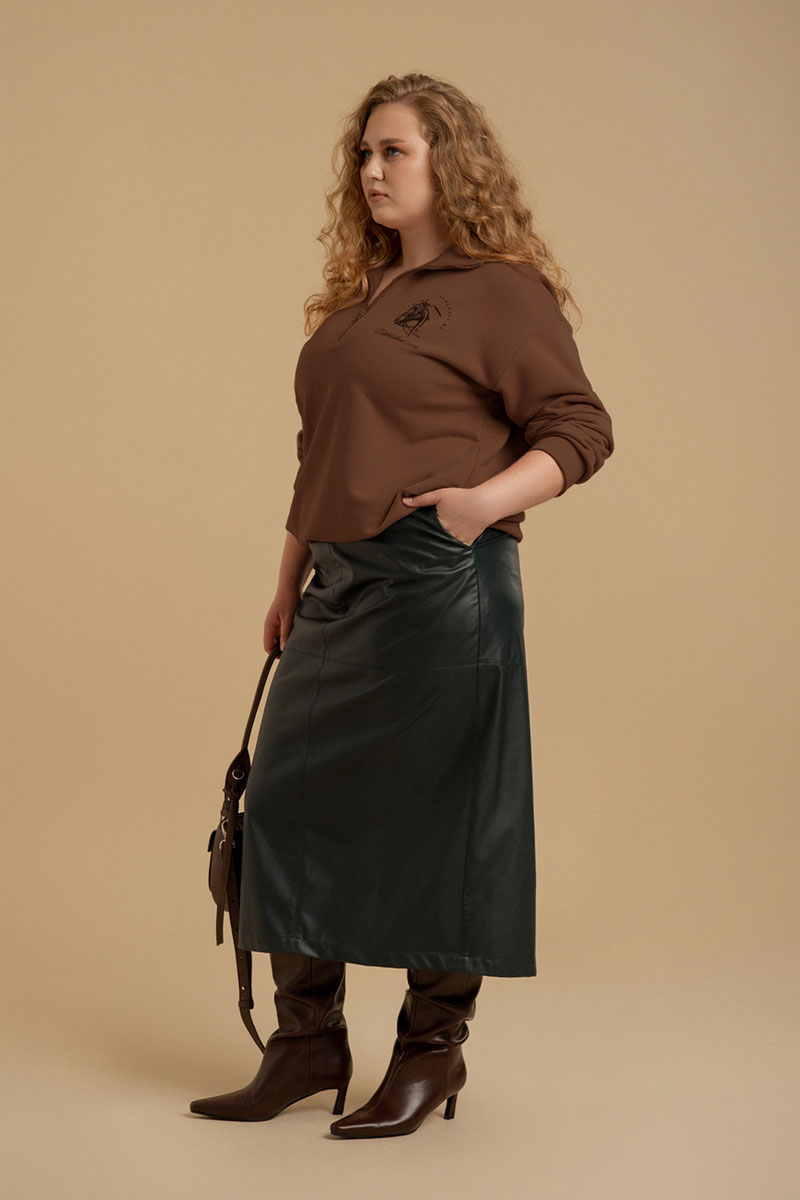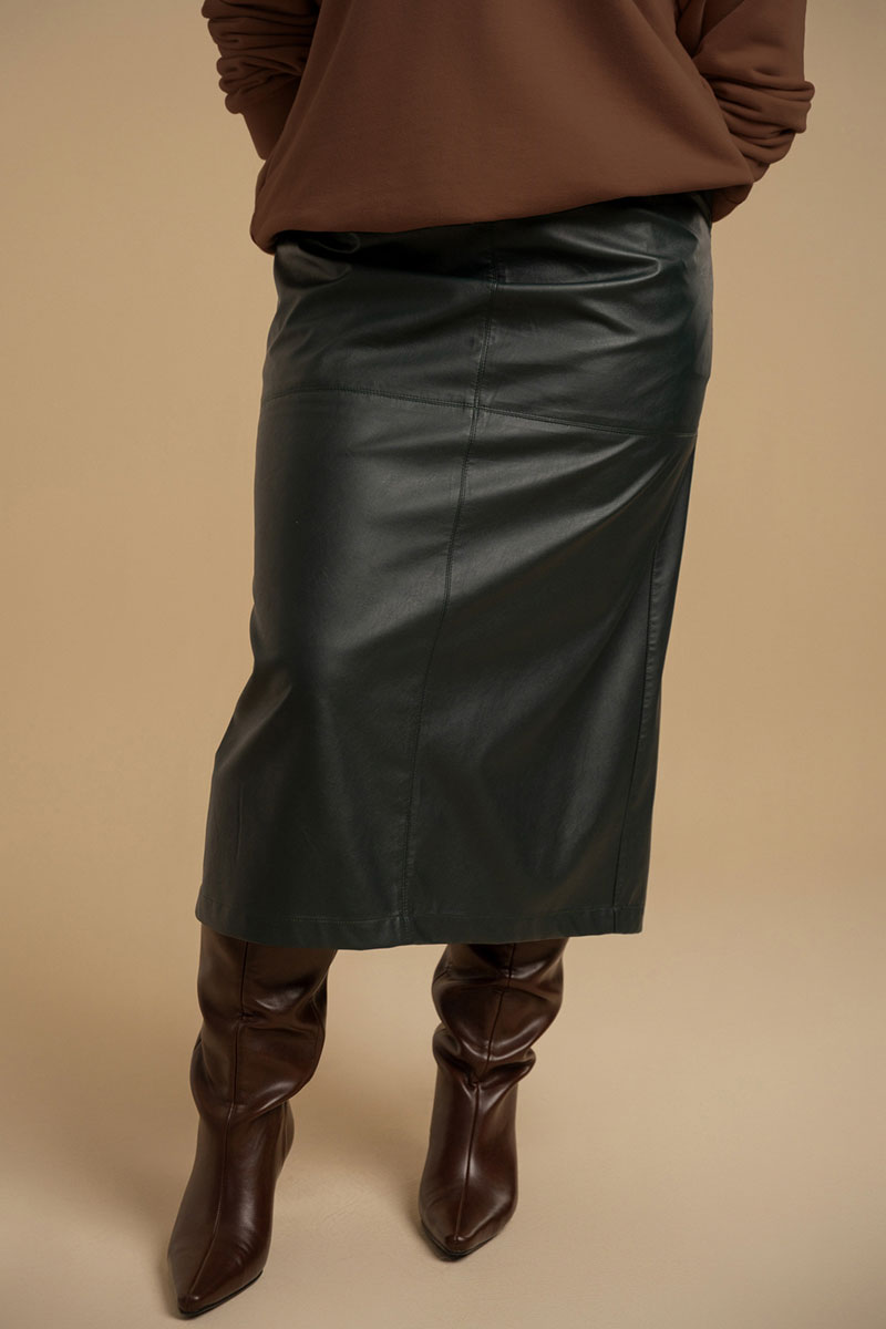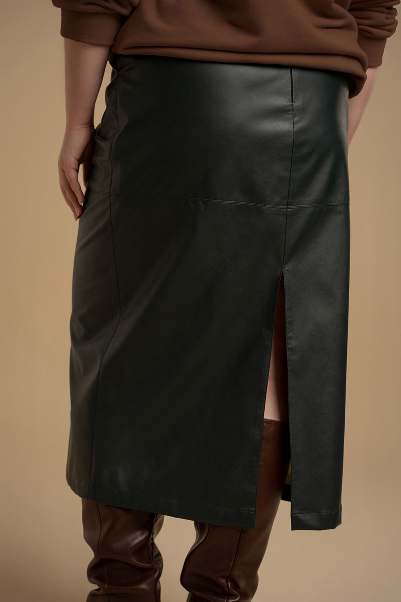 Юбка - зауженная к низу из искусственной кожи на хлопковой основе. линия пояса посажена на обтачку. В среднем шве спинки - разрез и застежка - молния. В боковых швах - карманы. Изделие посажено на подкладку.
