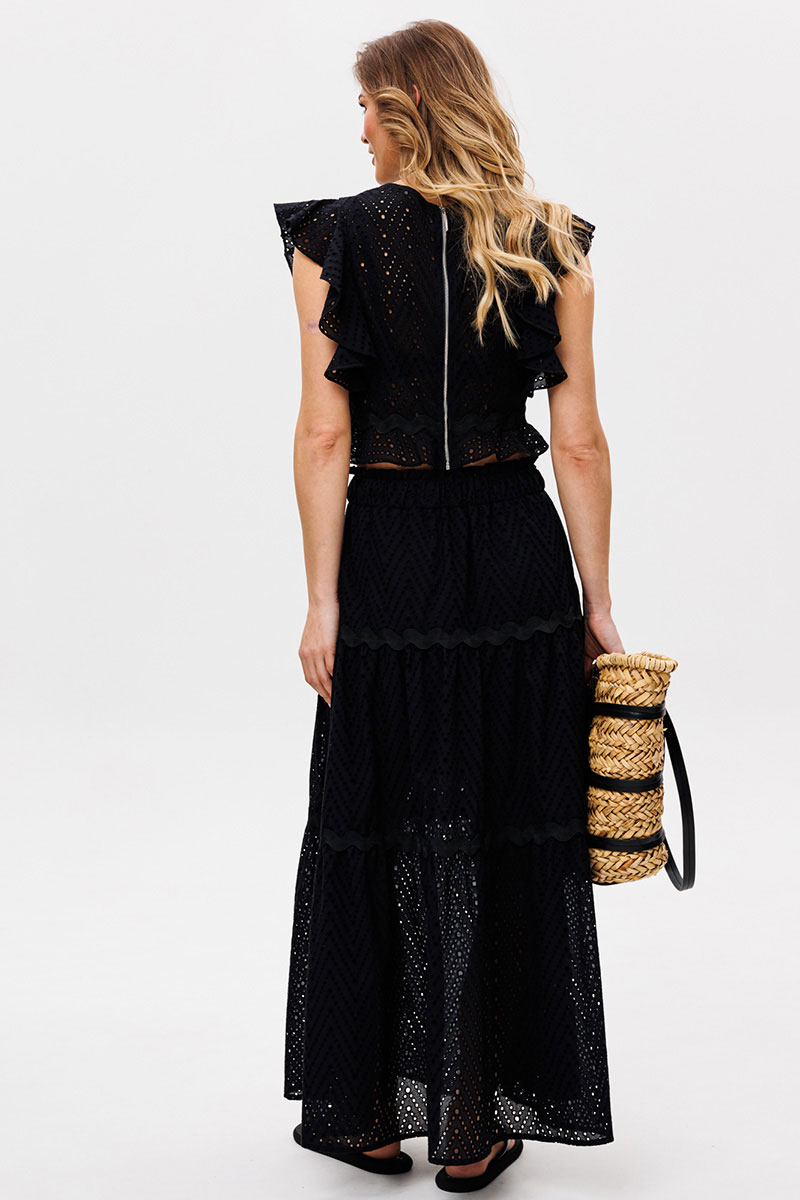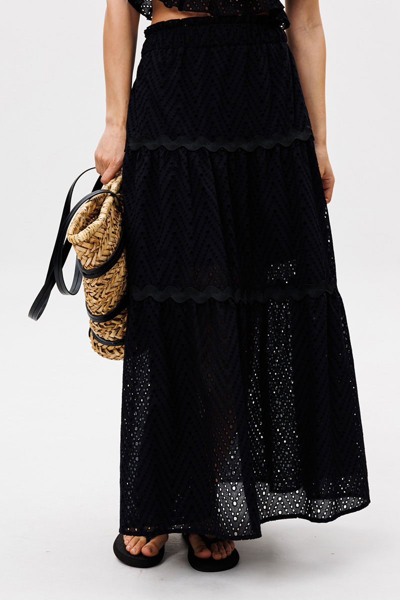 Юбка на притачном поясе, длиной миди, расширена к низу. Переднее и заднее полотнища состоят из трех ярусов, присборенных по линии притачивания друг к другу. Юбка на отлетной по низу подкладке до линии колена.