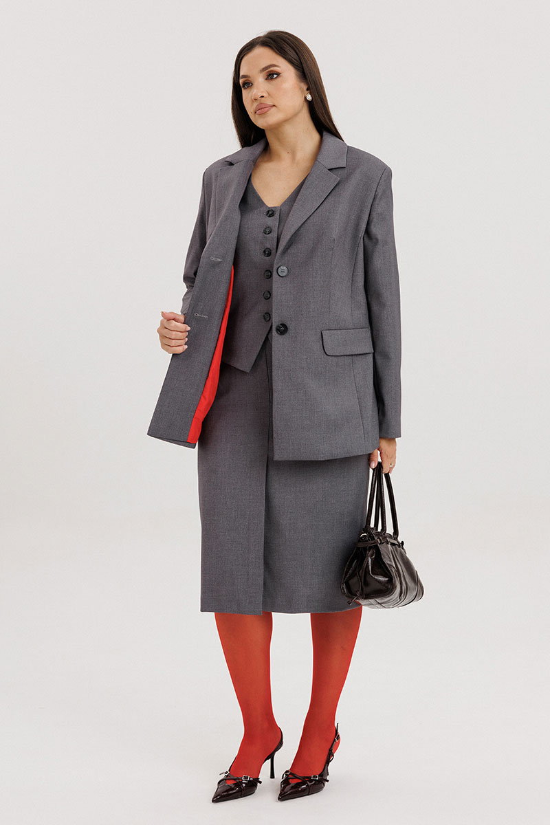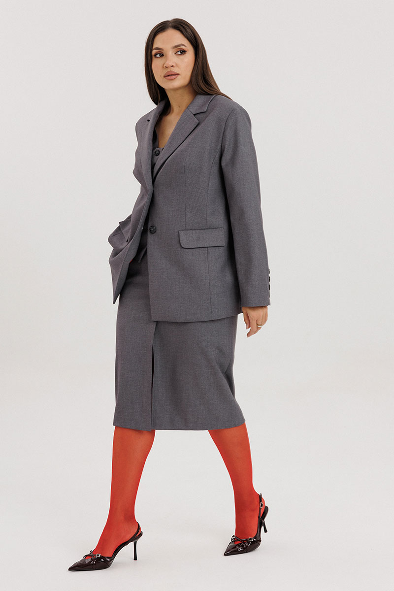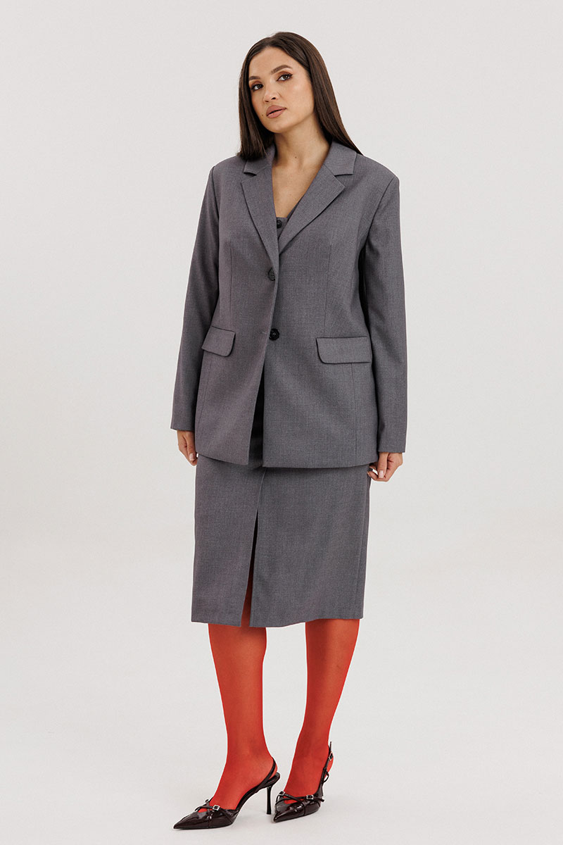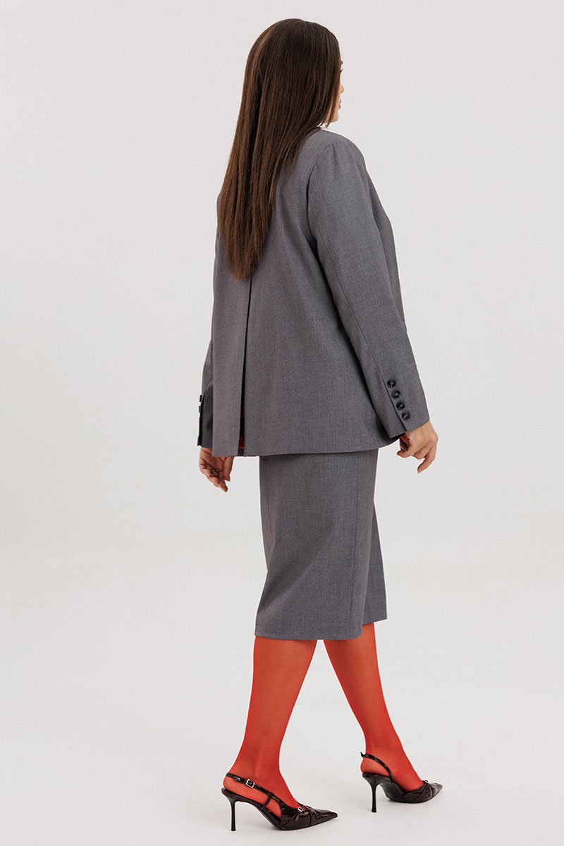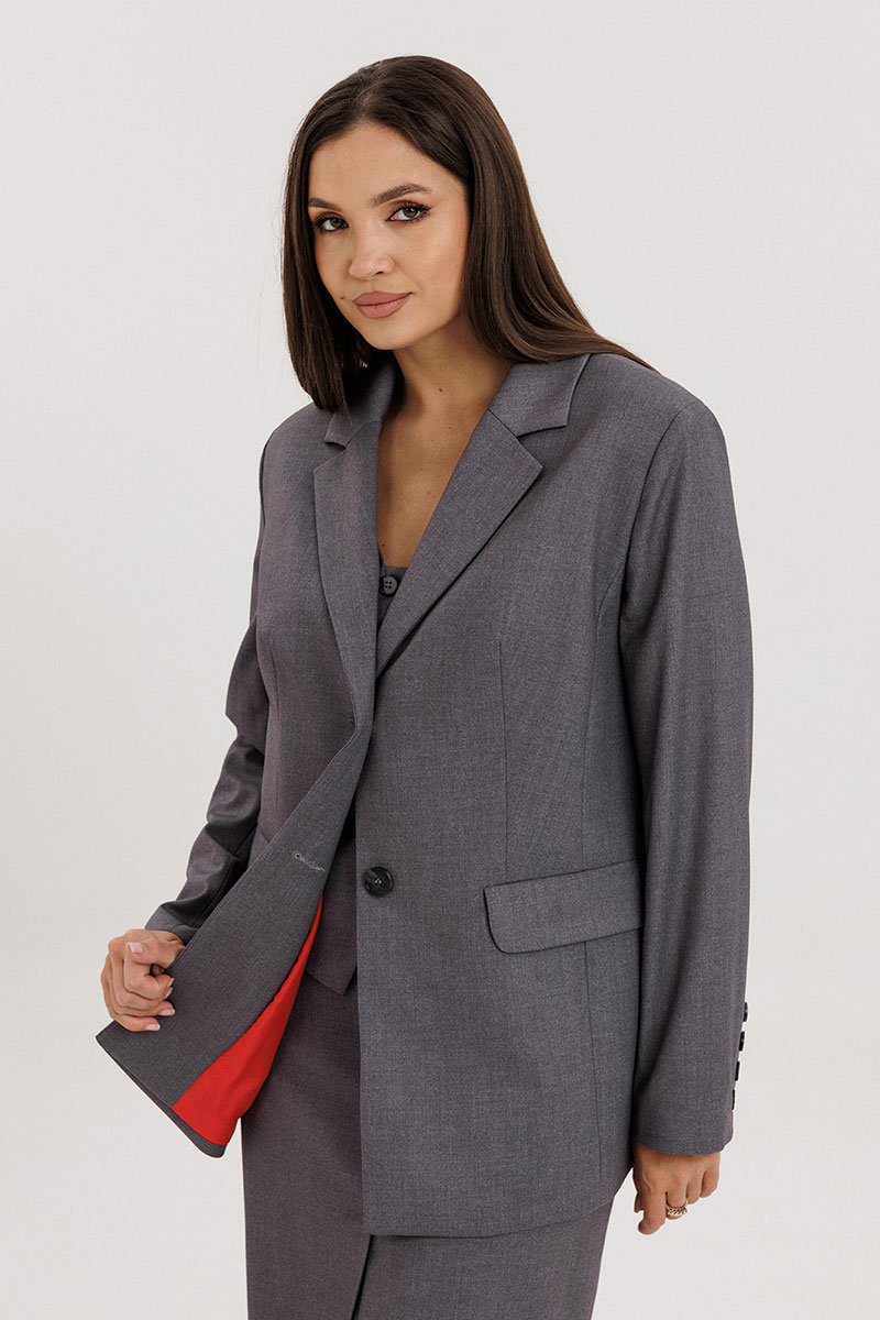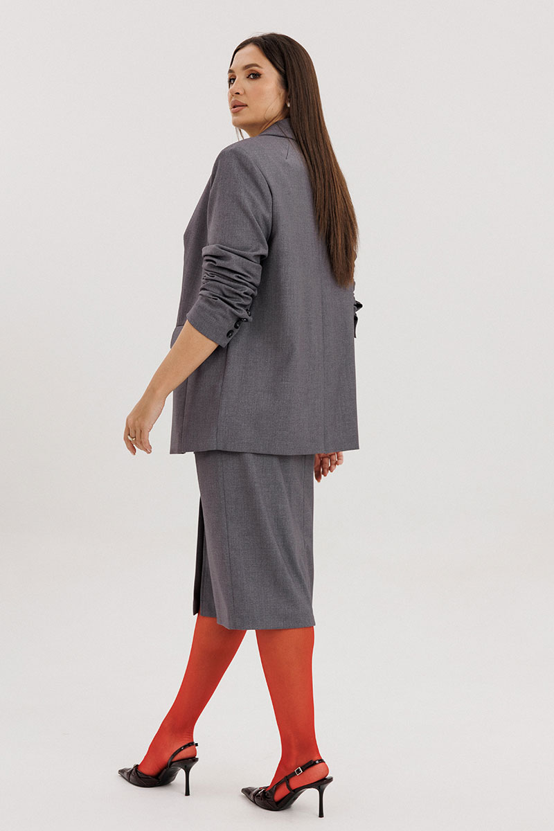 Жакет свободного расширенного силуэта, втачного покроя с центральной застёжкой и классическим английским воротником. Полочка с отрезным бочком, нагрудной вытачкой и прорезным карманом с клапаном. Спинка с центральным швом, высокой шлицей и отрезным бочком. Рукав двухшовный с отлетной шлицей и отделочными пуговицами.