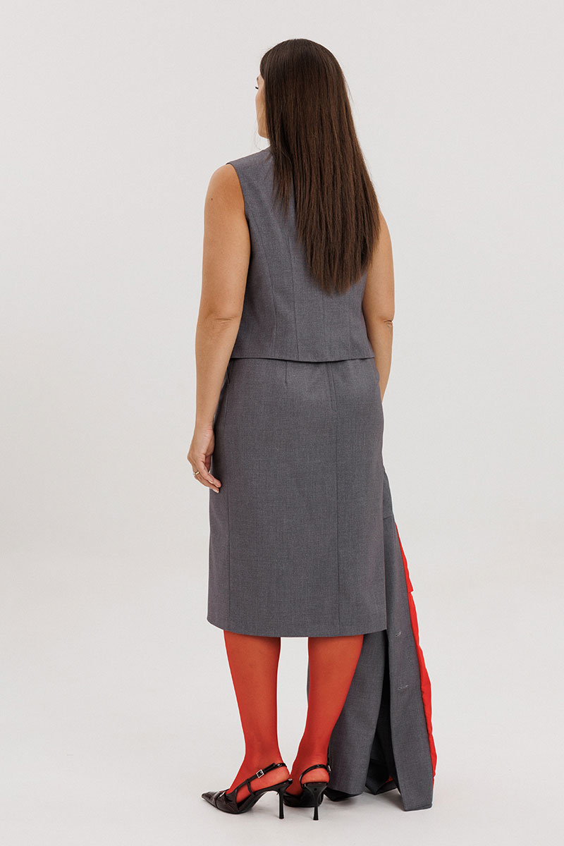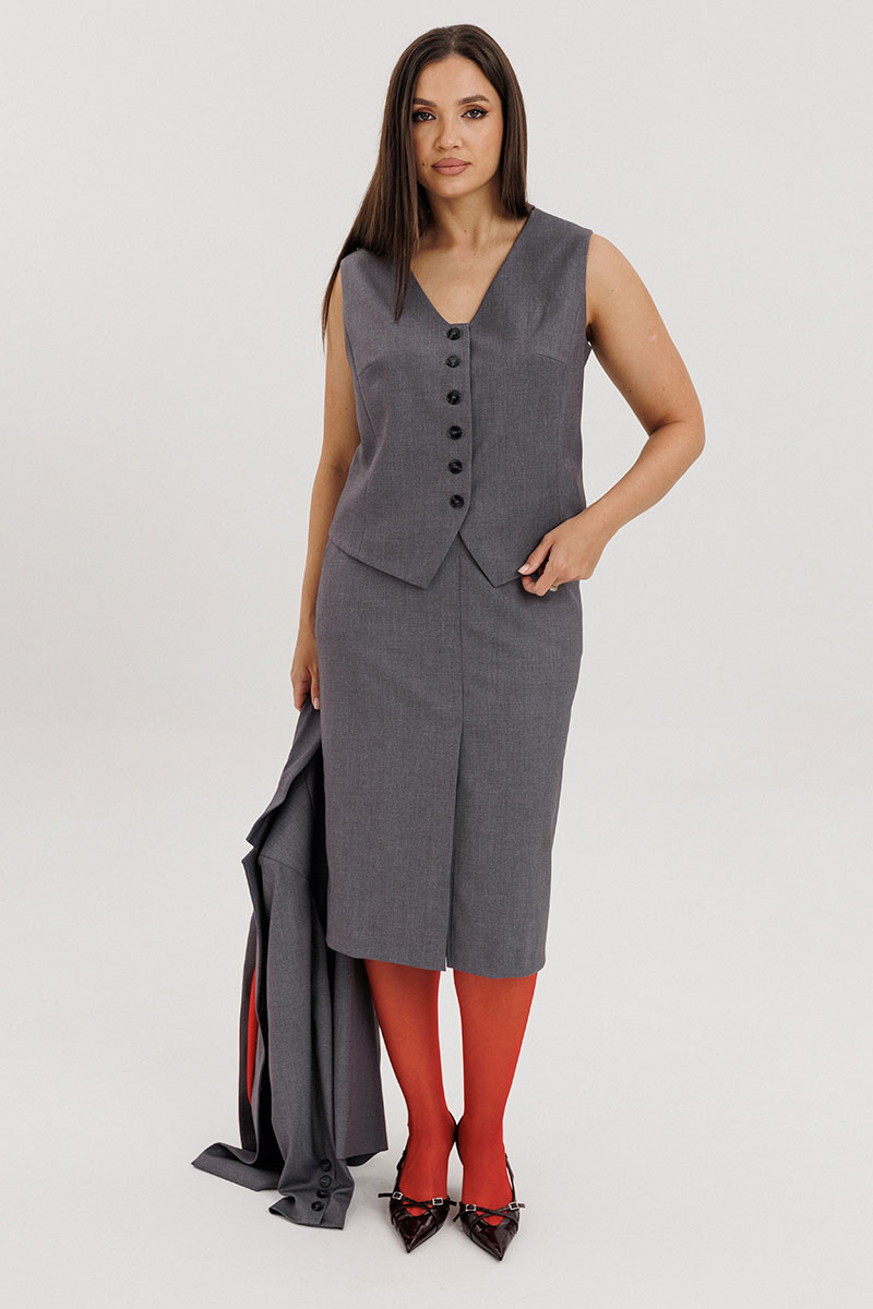Юбка классическая длиной миди с притачным поясом, эластичным в области спинки, центральным швом и разрезом по переднему полотнищу.