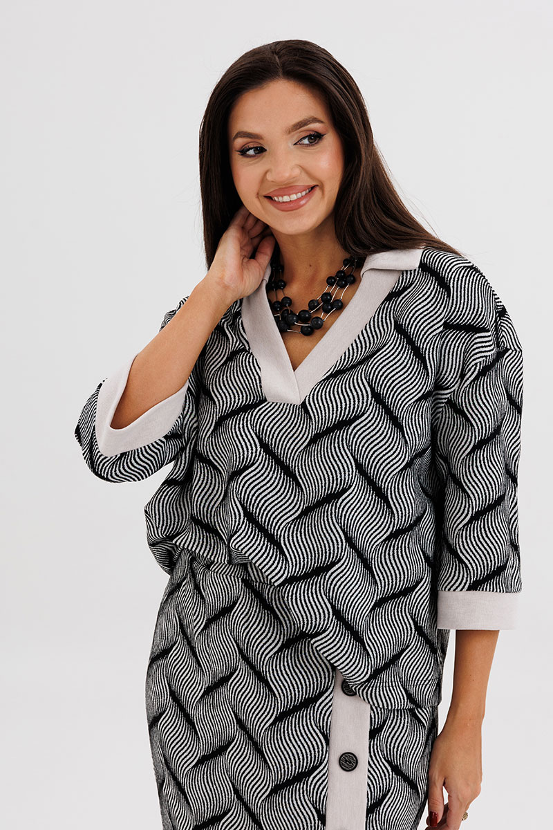 Свободный упрямлённый джемпер с вырезом поло, воротником и отделкой из контрастного трикотажного полотна.