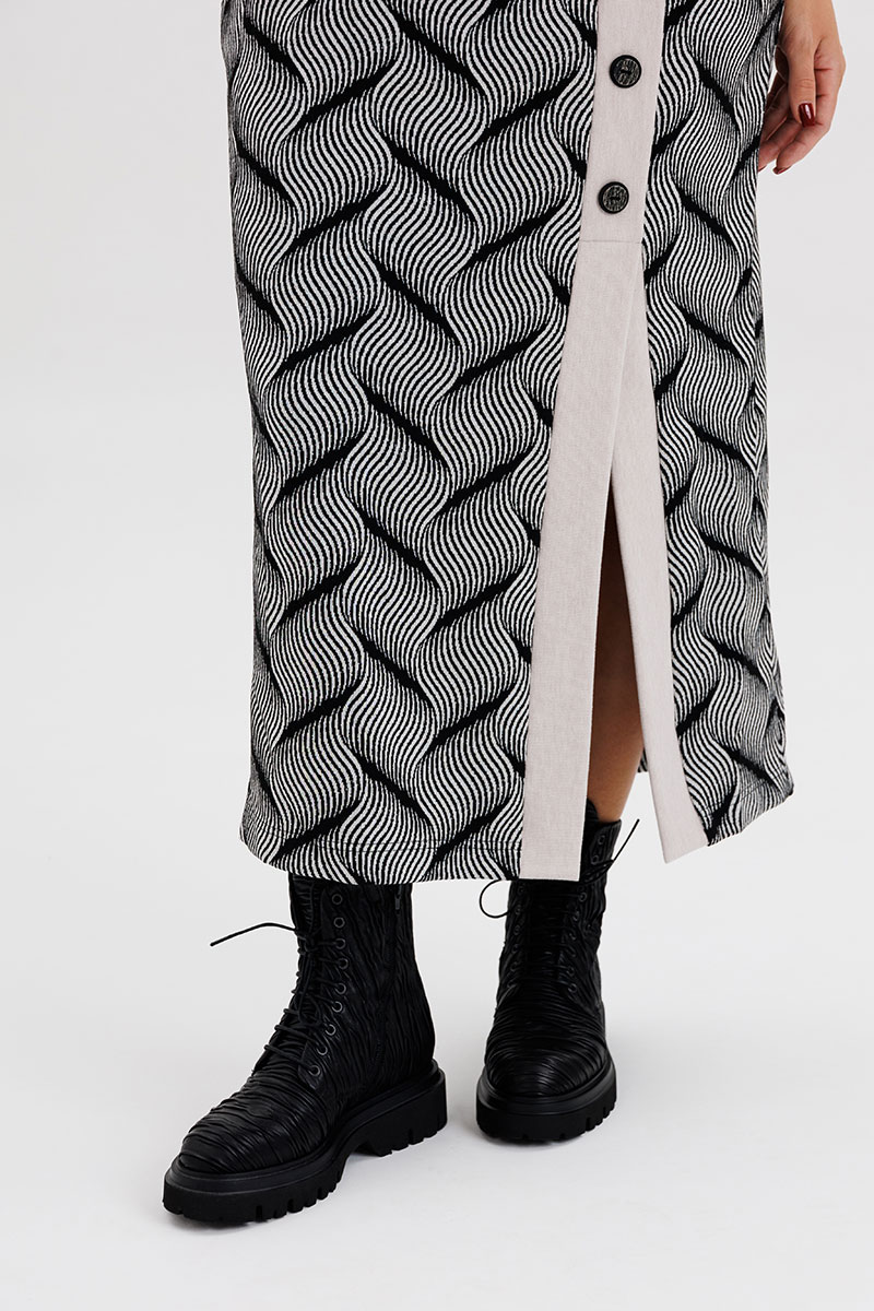 Юбка прямая. с эффектной шлицей по левой стороне переда и отделкой из контрастного полотна. Пояс юбки на эластичной тесьме в области спинки, с застёжкой по центру заднего полотнища.