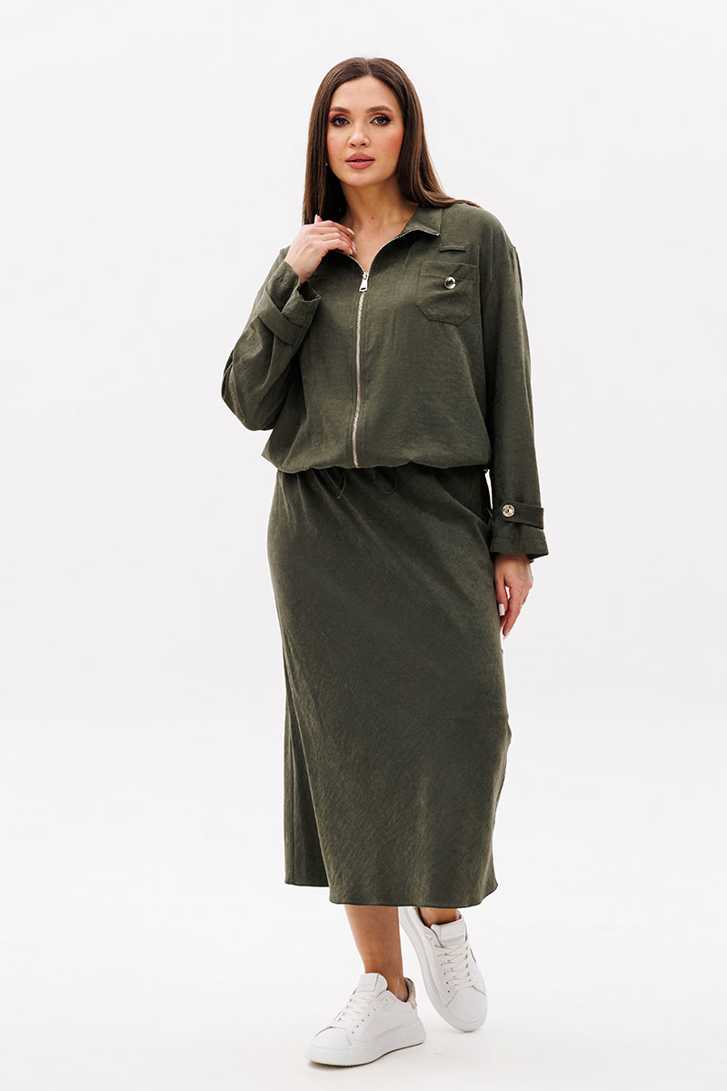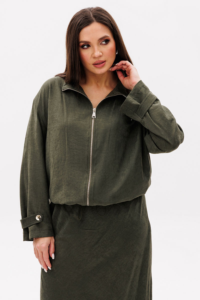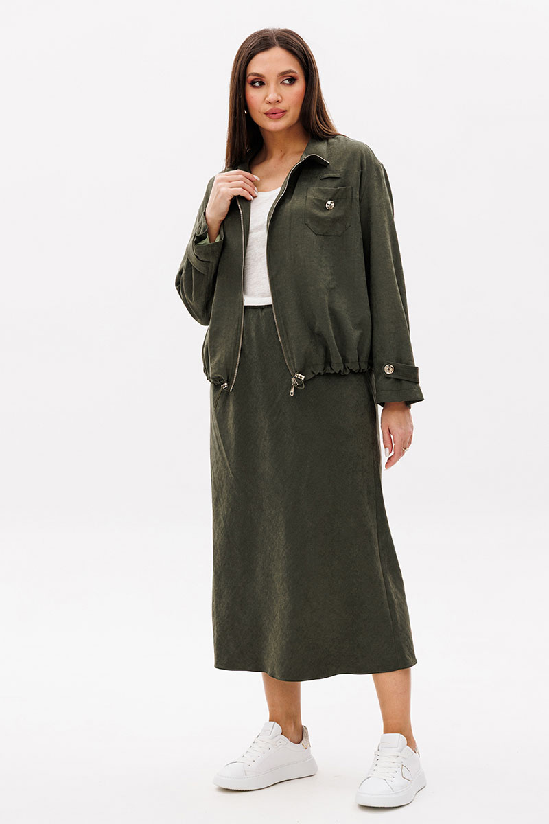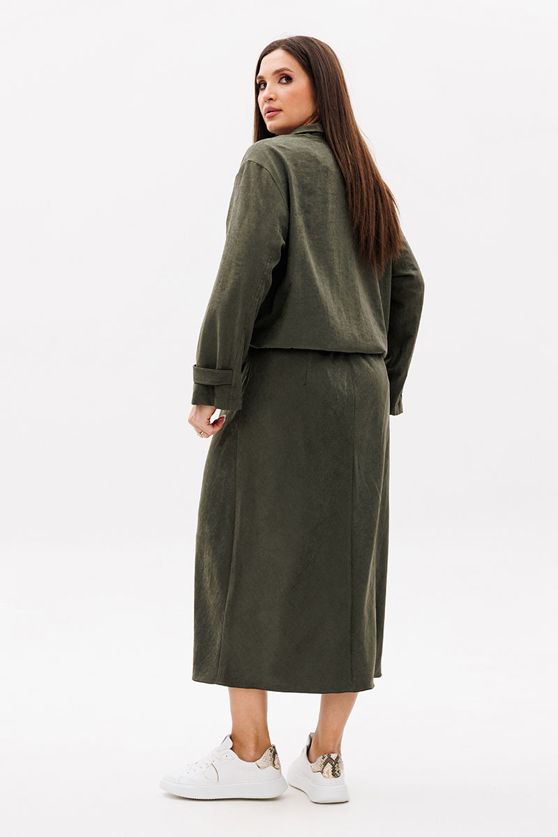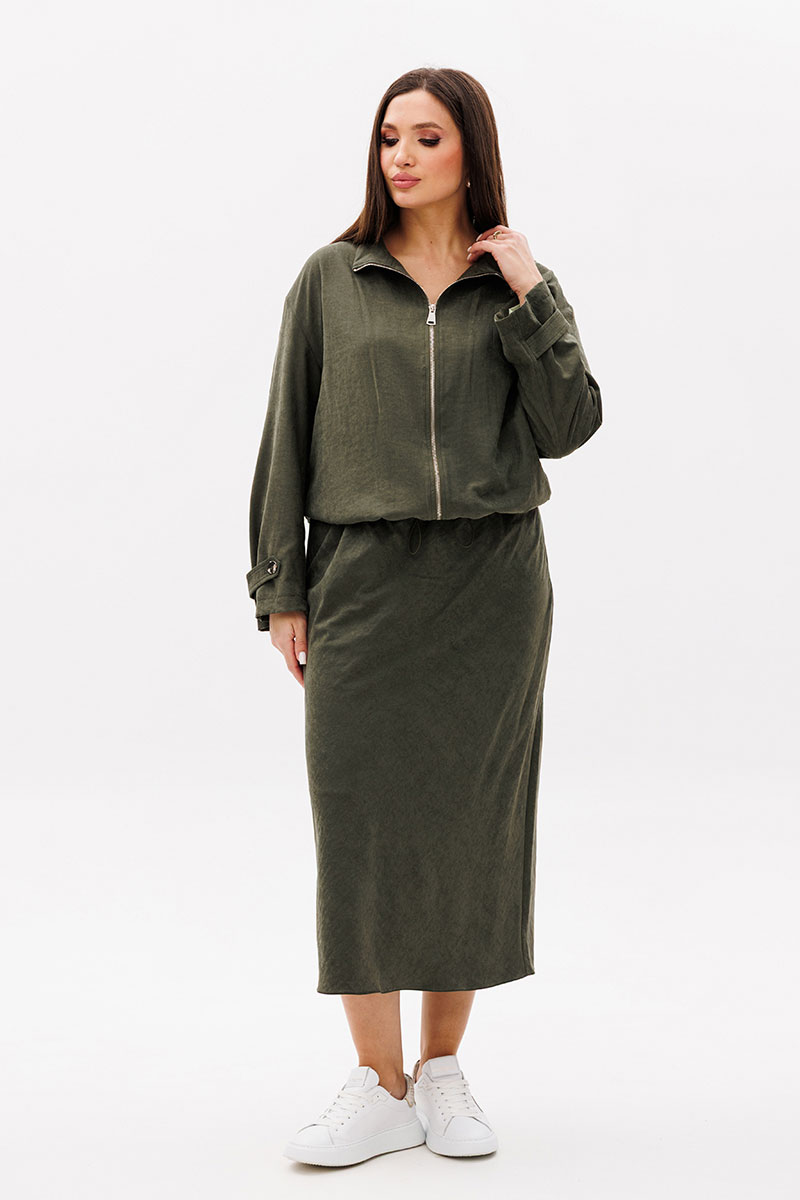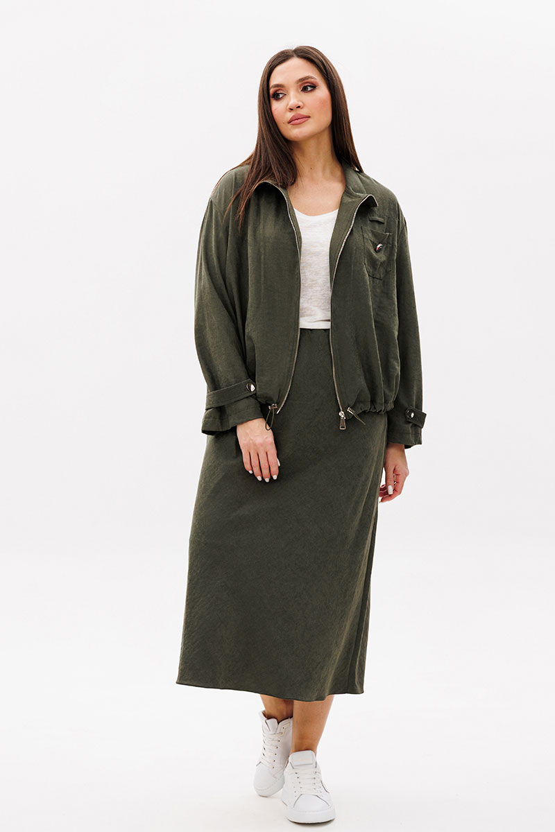Свободная куртка на подкладке и юбка, косого кроя, из невероятного полотна с эффектом "бархатистости" или в народе "мокрым эффектом". Куртка свободного силуэта, рубашечного покроя с воротником-стойкой и центральной застежкой на тесьму-молнию. Полочка с накладным карманом в области груди. Рукав с патой на пуговице в нижней части. По низу куртки-кулиса, с эластичной тесьмой и фиксаторами.