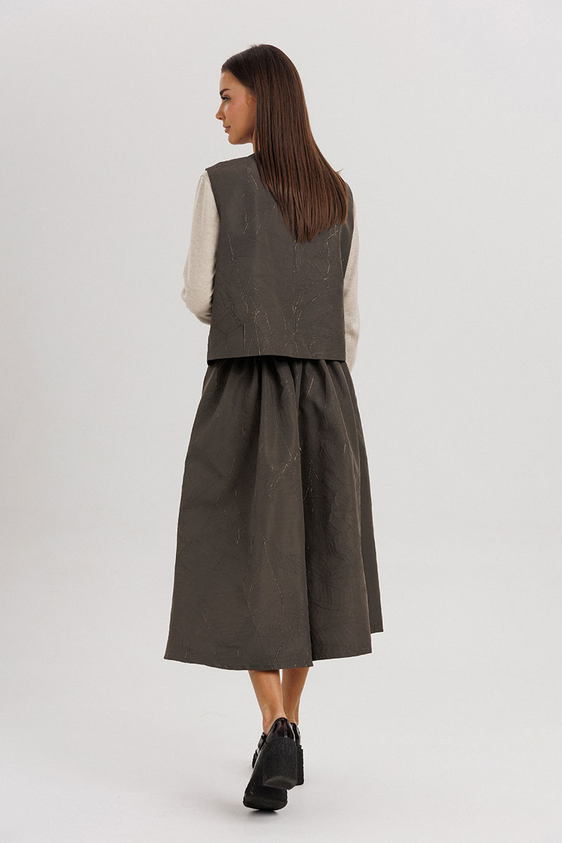 Жилет выполнен из плотной фактурной ткани с декоративной асимметричной застёжкой на пуговицы — этот элемент придаёт образу динамичность и оригинальность. Юбка длиной миди с мягкими складками красиво драпируется и подчеркивает женственность силуэта. Лонгслив из мягкого трикотажа обеспечивает комфорт и добавляет легкости всему ансамблю.