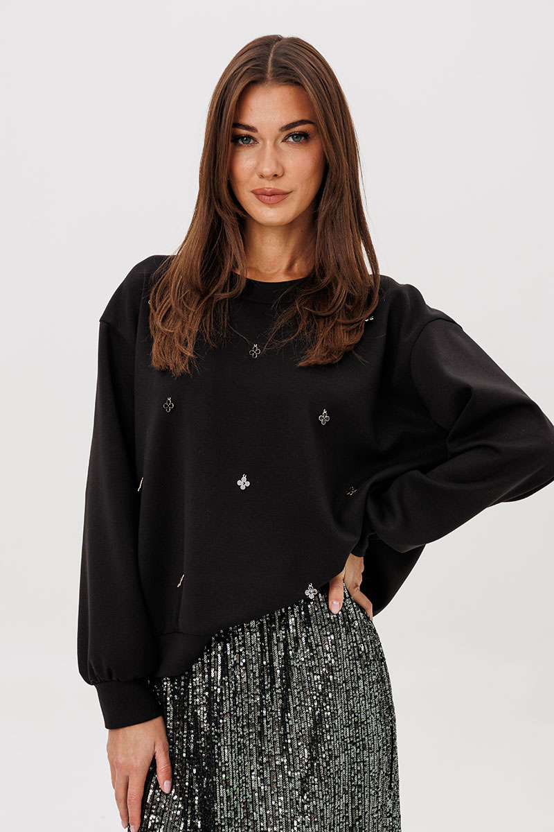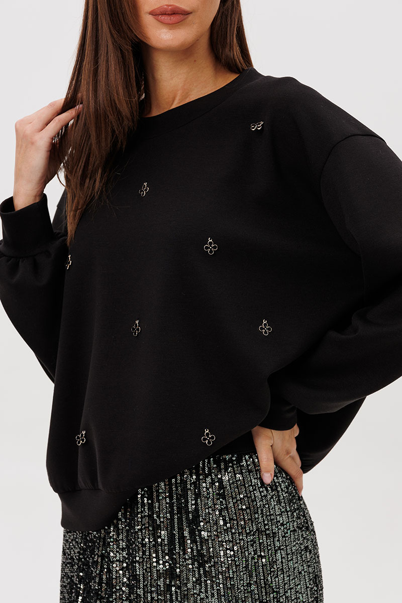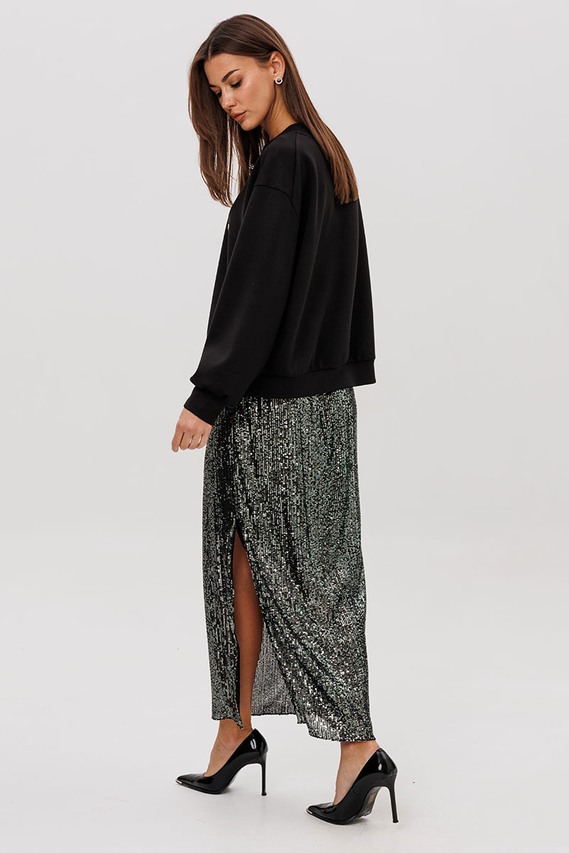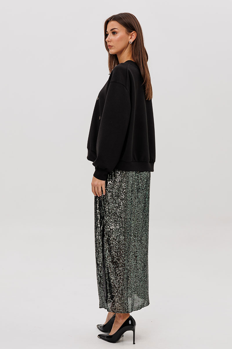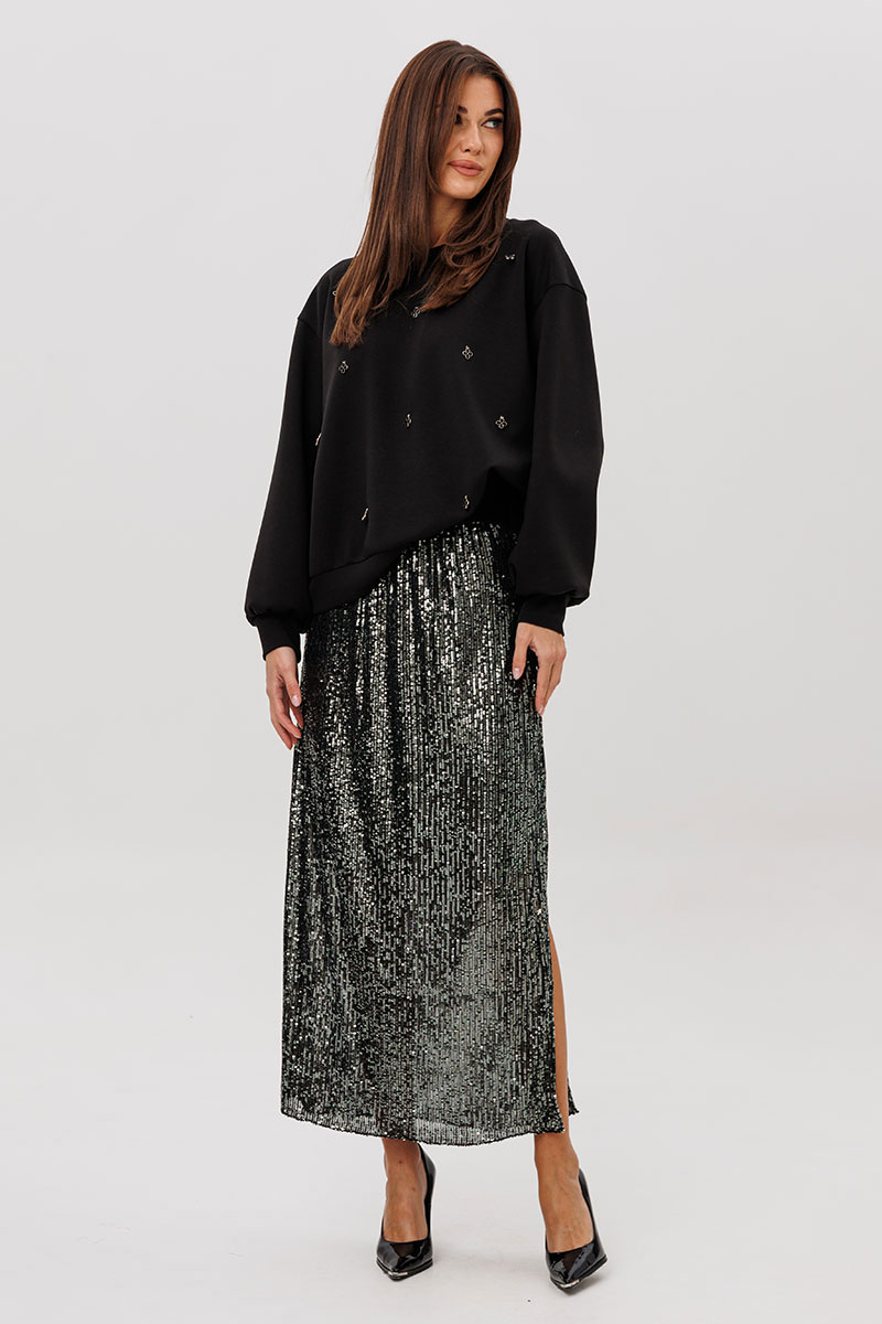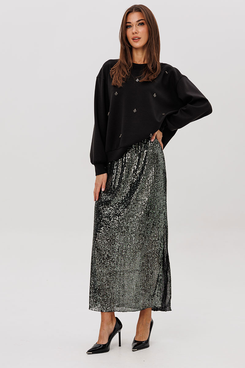 Стильный комплект, сочетающий уют и женственность. Мягкий свитшот из комфортного трикотажа украшен ручной расшивкой декоративными элементами в форме «клевера» — утончённая деталь, создающая акцент на естественной элегантности. Юбка выполнена из трендового полотна в пайетку. Юбка прямая, длинная на эластичном поясе и подкладке.