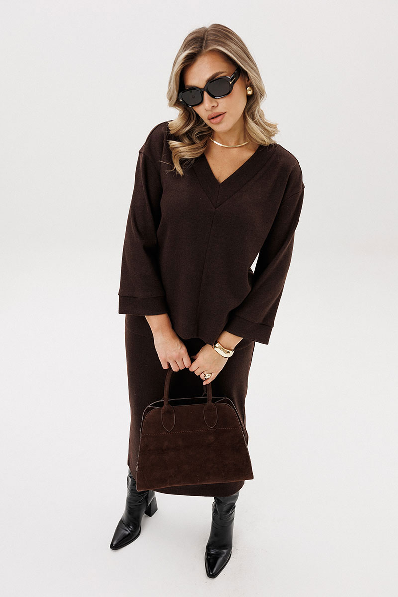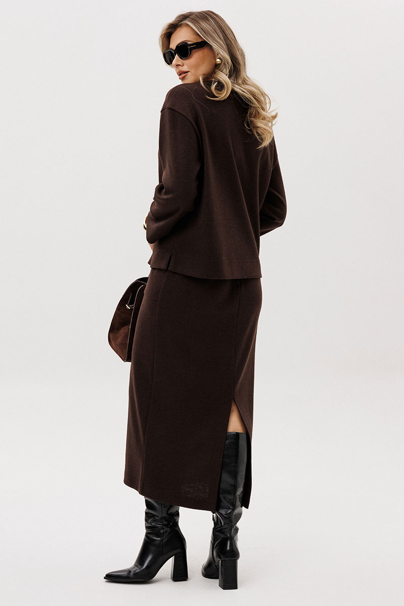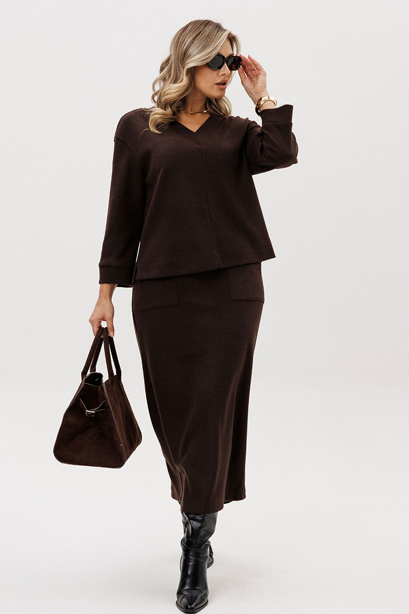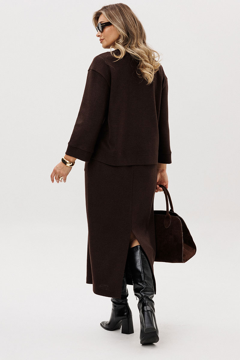 Модный "must have" осенне-зимнего сезона - трикотажный костюм с длинной юбкой, и эта длина - максимальна. В тандеме со слегка укороченным верхом простота и элегантность выходят на максимальный уровень.