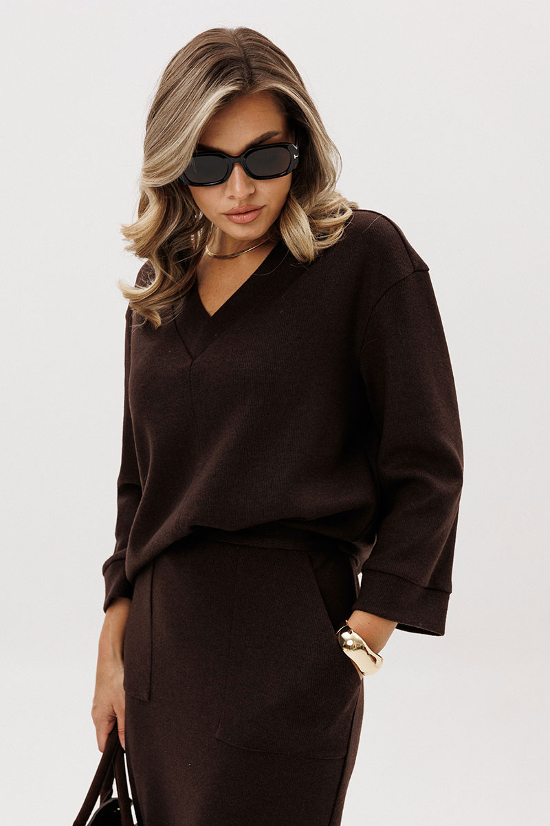 Свободный упрямлённый джемпер с заниженной линией плеча, V-образным вырезом и рукавом длиной 7/8. По горловине и низкам рукавов - отделочные полоски.