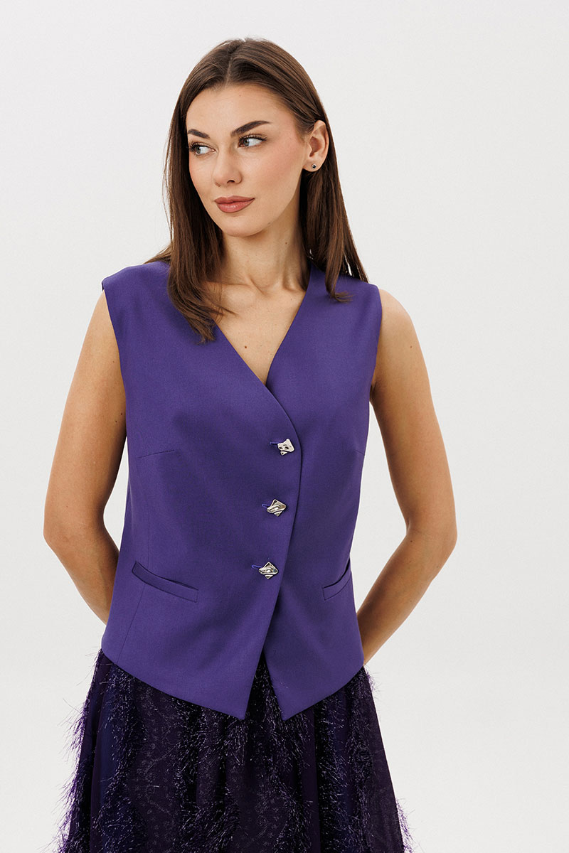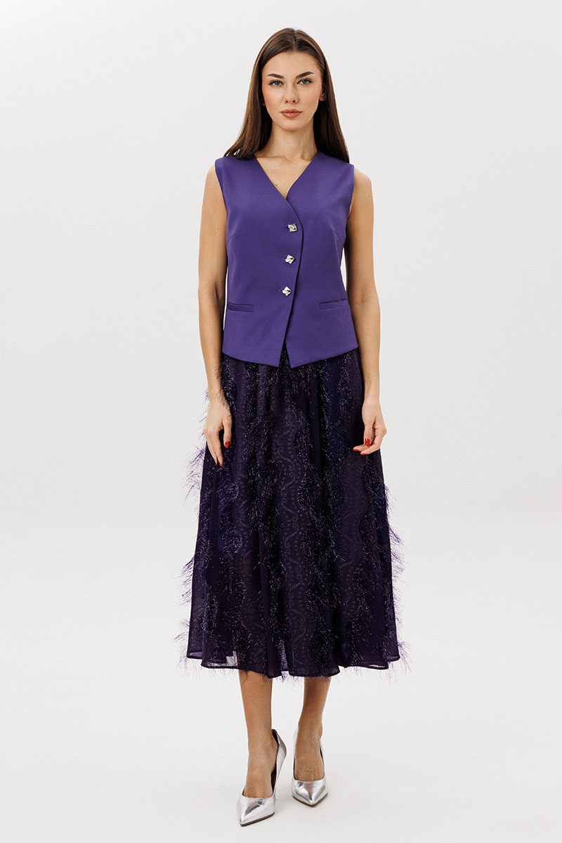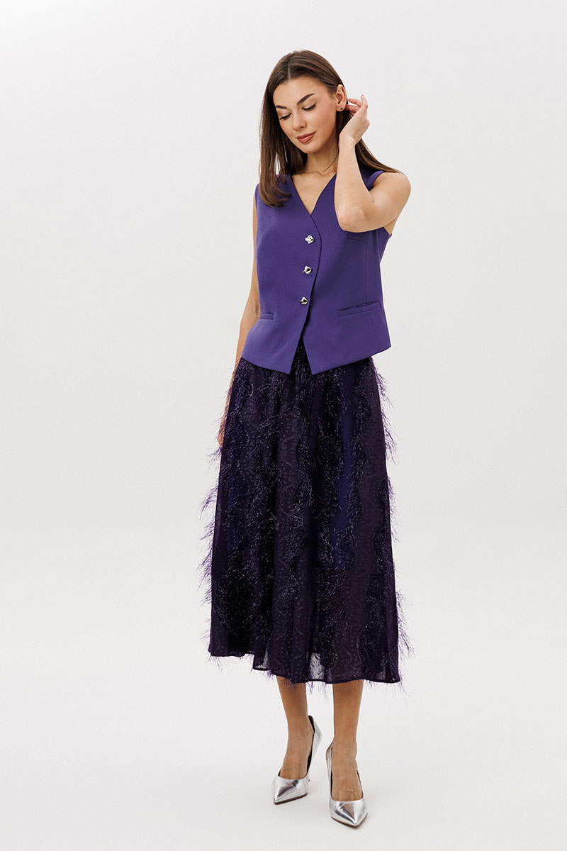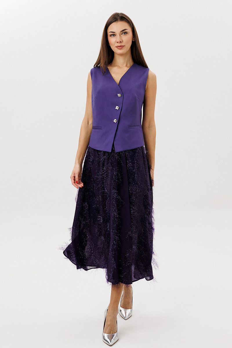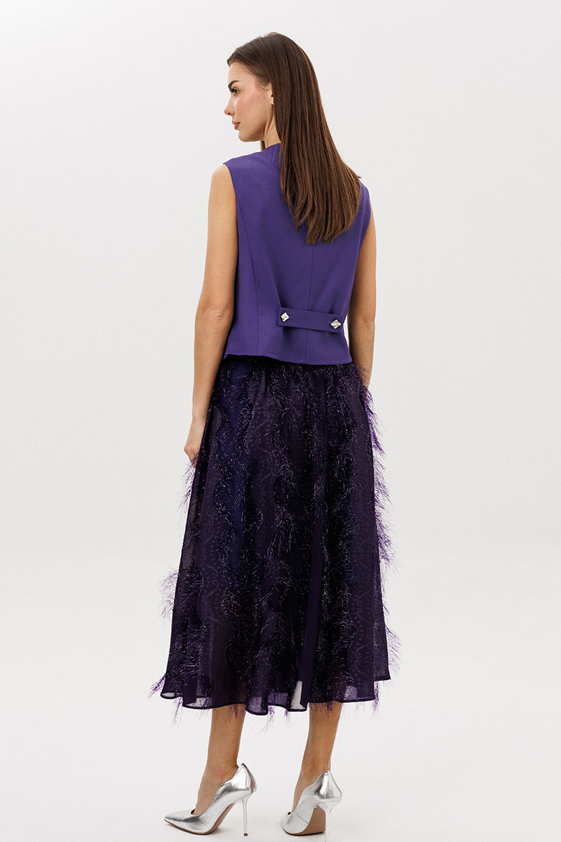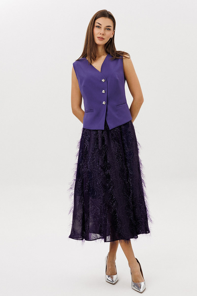 Актуальный комплект, в котором строгая геометрия жилета гармонично сочетается с романтичной женственностью многослойной юбки.