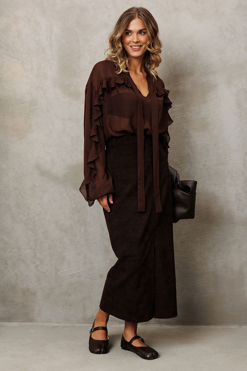 Юбка прямого силуэта выполненная из мягкой вельветовой ткани. Передняя честь юбки с вытачками, со средним швом и застежкой гульфиком на молнии и щлицей спереди. Задняя часть юбки с вытачками. Юбка на притачном поясе с затежкой на петлю и пуговицу спереди и резинками по бокам. Юбка на подкладке.