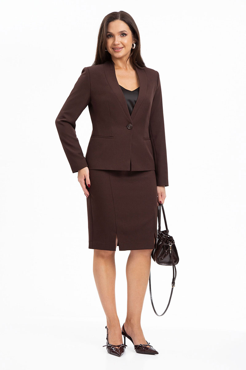 Цветовая гамма для верха, подкладки, фурнитуры, отделки: Жакет и юбка выполнены из эластичной ткани одного вида. Все отделочные строчки выполнены в тон основной ткани