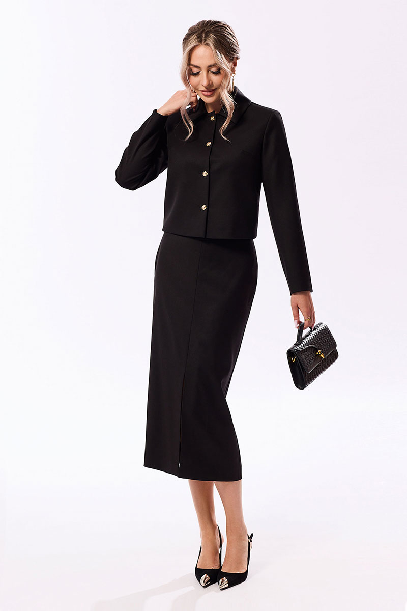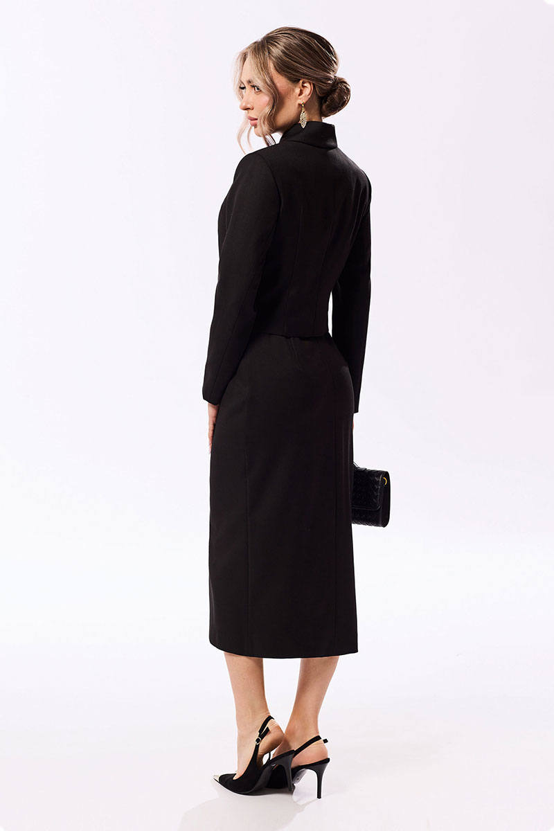 Жакет с центральной застежкой на петли и пуговицы, отложным врортником. По переду с нагрудными вытачками. По спинке со средним швом и талиевыми вытачками. Рукав втачной, длинный.