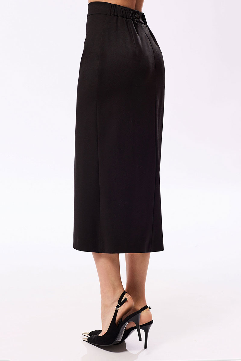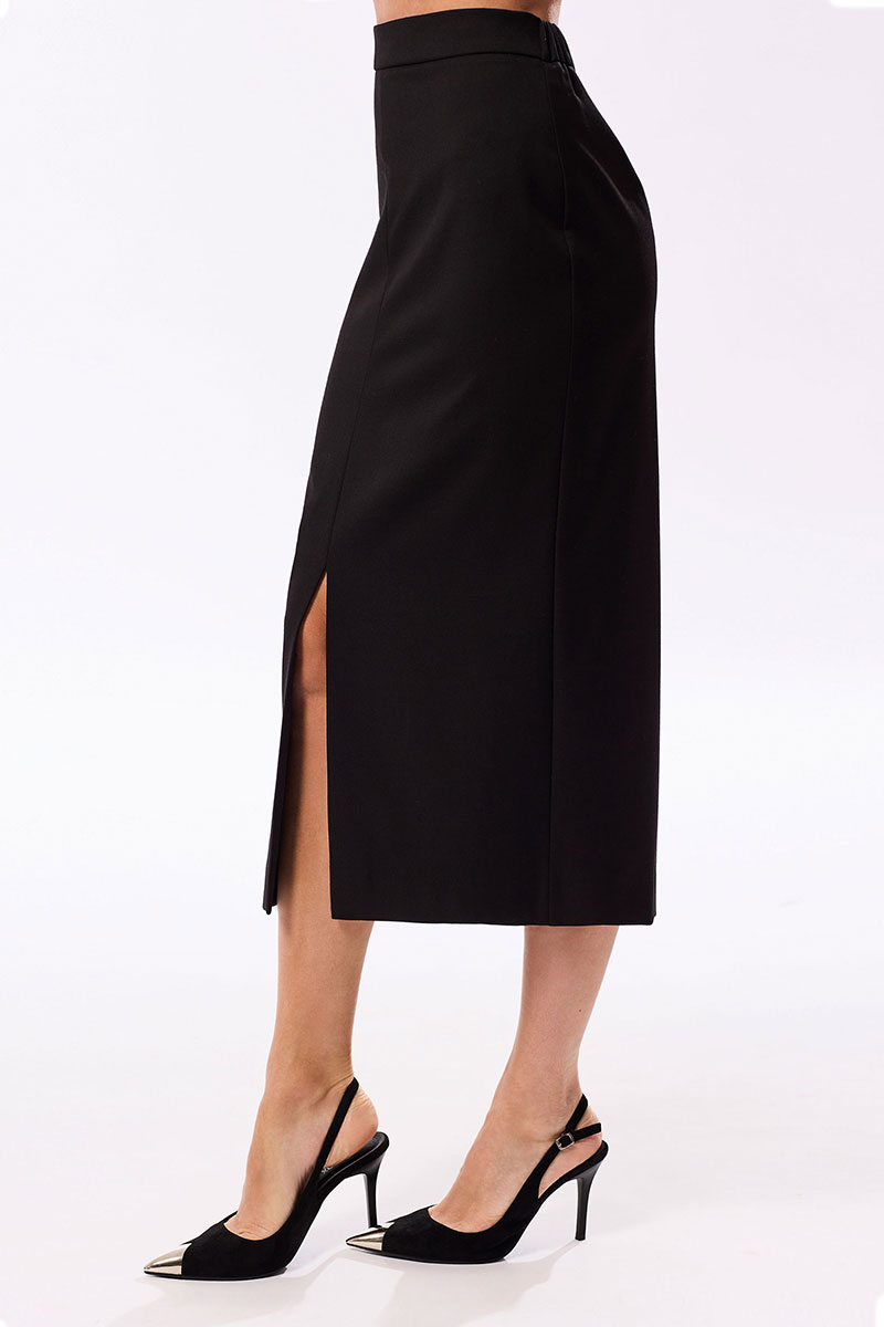 Юбка с отрезным поясом, застежкой на потайную молнию по среднему шву заднего полотнища. По переднему полотнищу односторонний рельеф с разрезом. Задняя половинка со средним швом, талиевыми вытачкам. В области спинки пояс присборен на резинку.