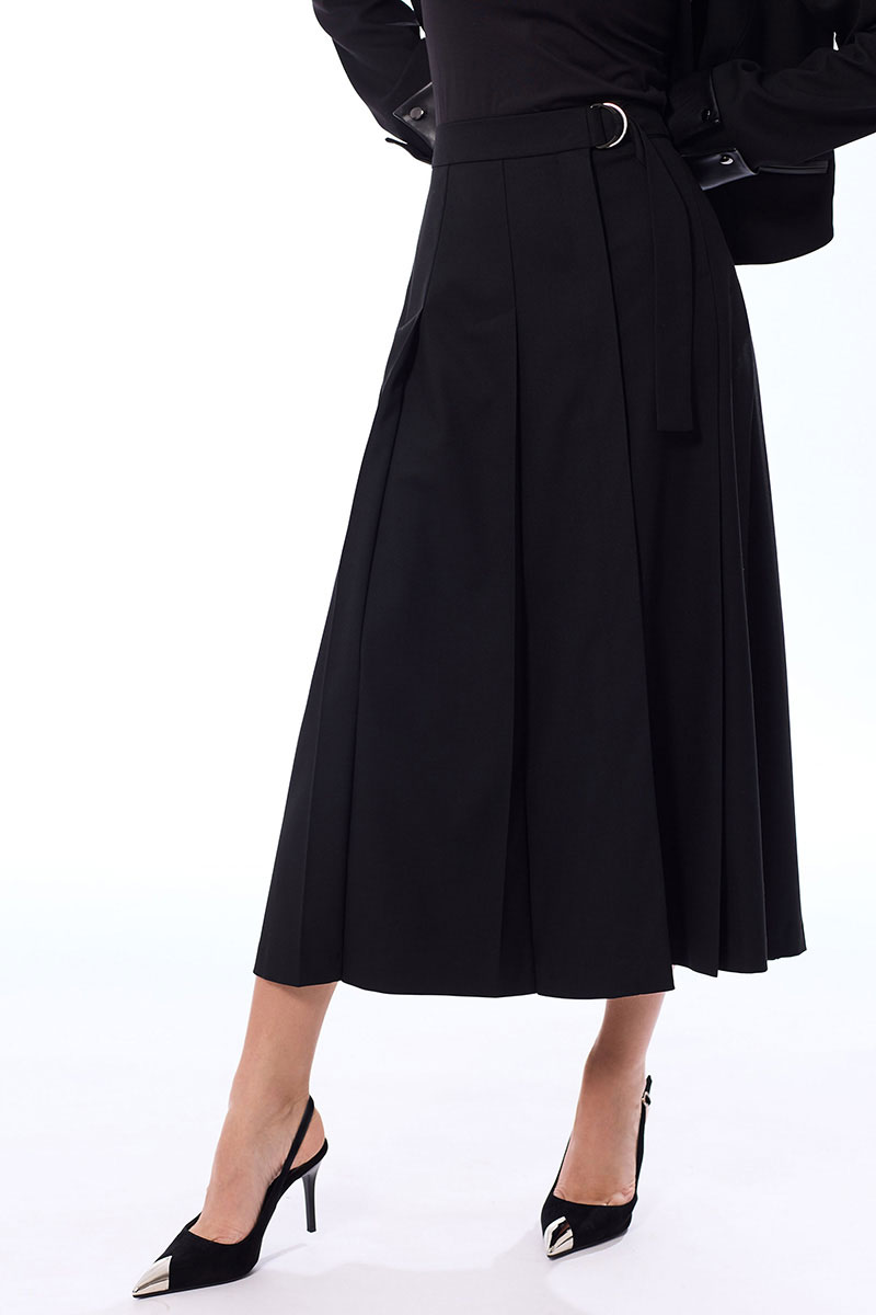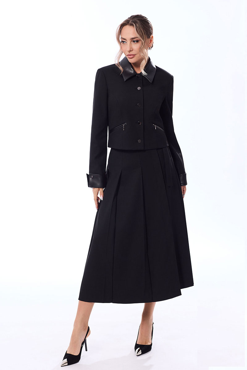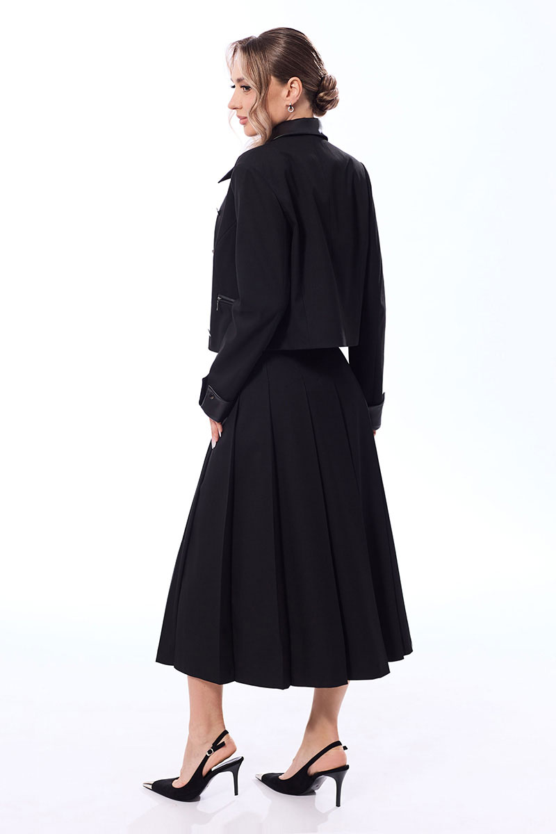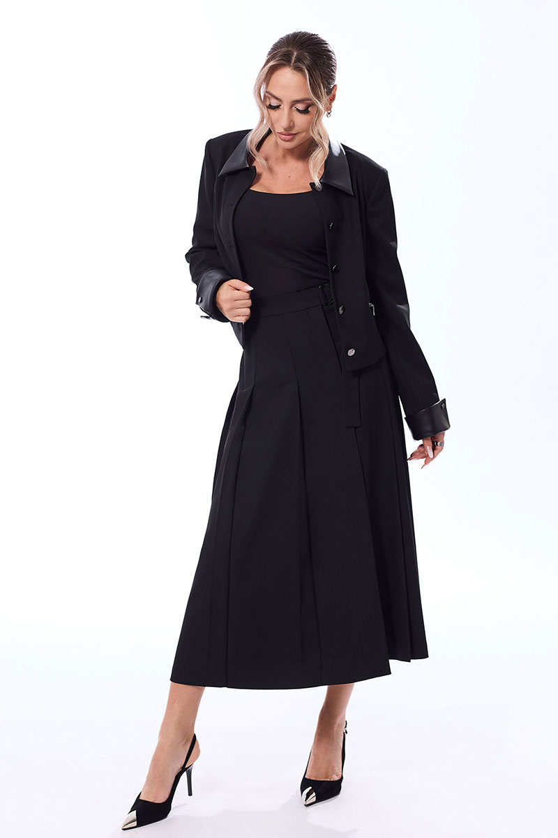 Юбка с отрезным поясом, односторонними складками по передней и задней половинке. На поясе- декоративная завязка, закрепленная полукольцами. На переднем полотнище- асимметричный разрез с застежкой на петли и пуговицы.