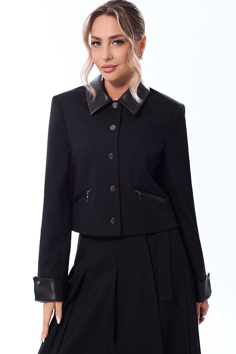 Цветовая гамма для верха, подкладки, фурнитуры, отделки: Жакет выполнен в одной цветовой гамме, строчки в тон основной ткани. Воротник, манжеты, рамки кармана- из кожзама в тон основной ткани