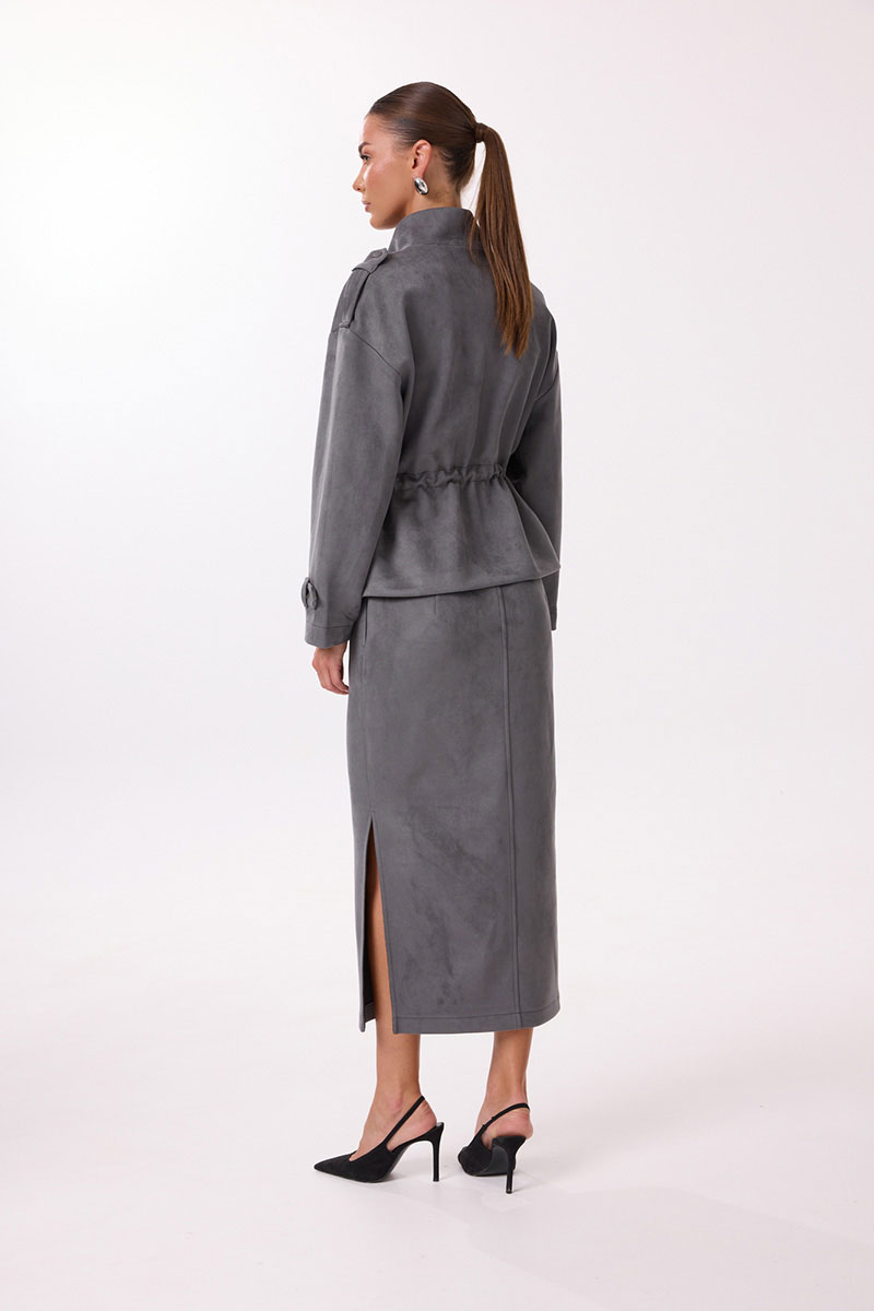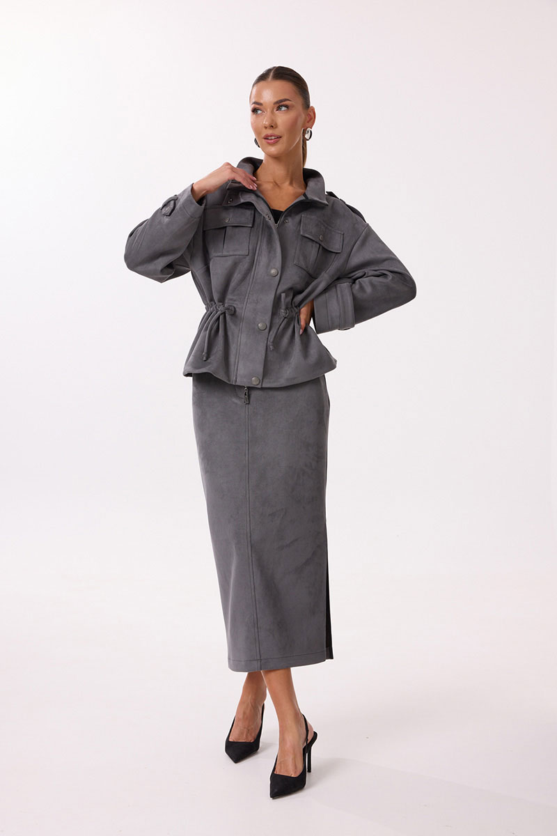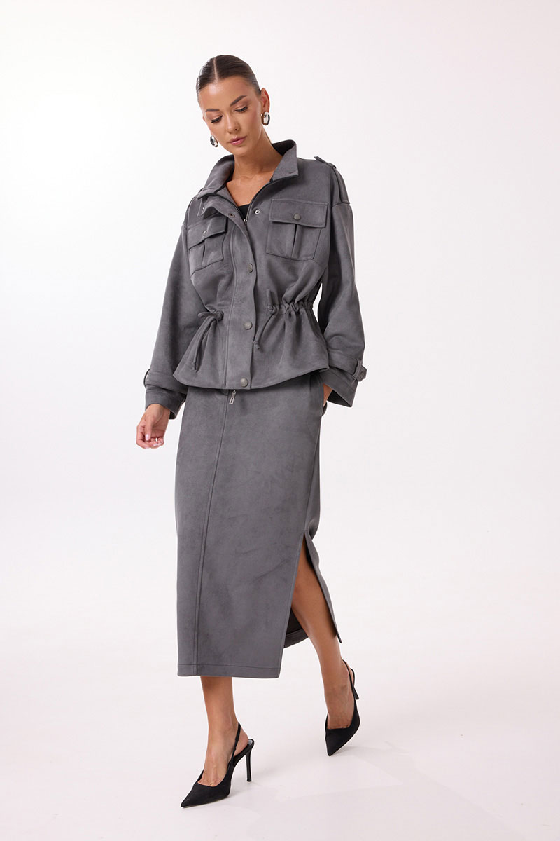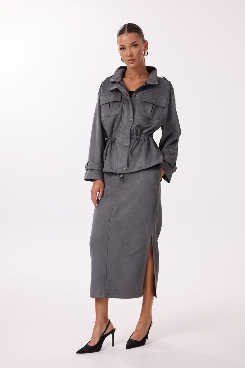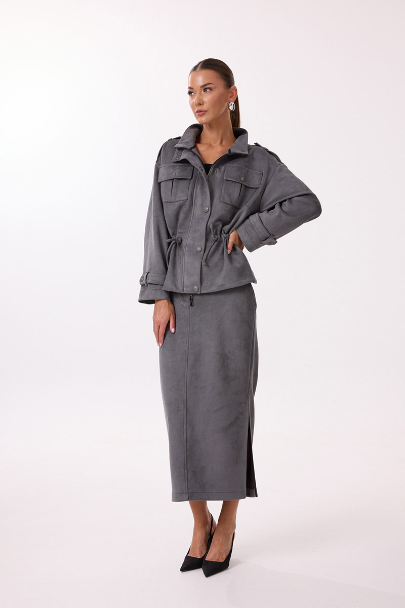 Жакет прямого силуэта с центральной застежкой на молнию. Перед с нагрудными накладными карманами с клапаном, застегивающимся на кнопку, обработана притачная планка с кнопками, закрывающая застежку. Спинка цельнокроеная. Плечо спущено, обработана декоративная пата с кнопкой. Рукав длинный одношовный, по низу декорирован патой с кнопкой. В области талии расположена кулиса для регулирования степени прилегания. Горловина обработана притачной стойкой.