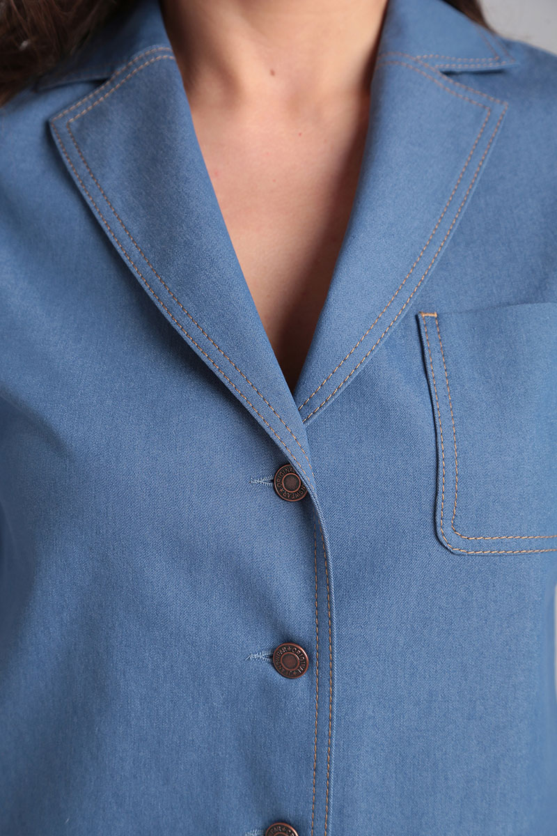 Жакет укороченный прямого силуэта, втачного покроя,без подкладки. По переду нагрудный карман. Воротник пиджачного типа. Рукав втачной, укороченный. Застежка центральная бортовая на металлические кнопки и петли.