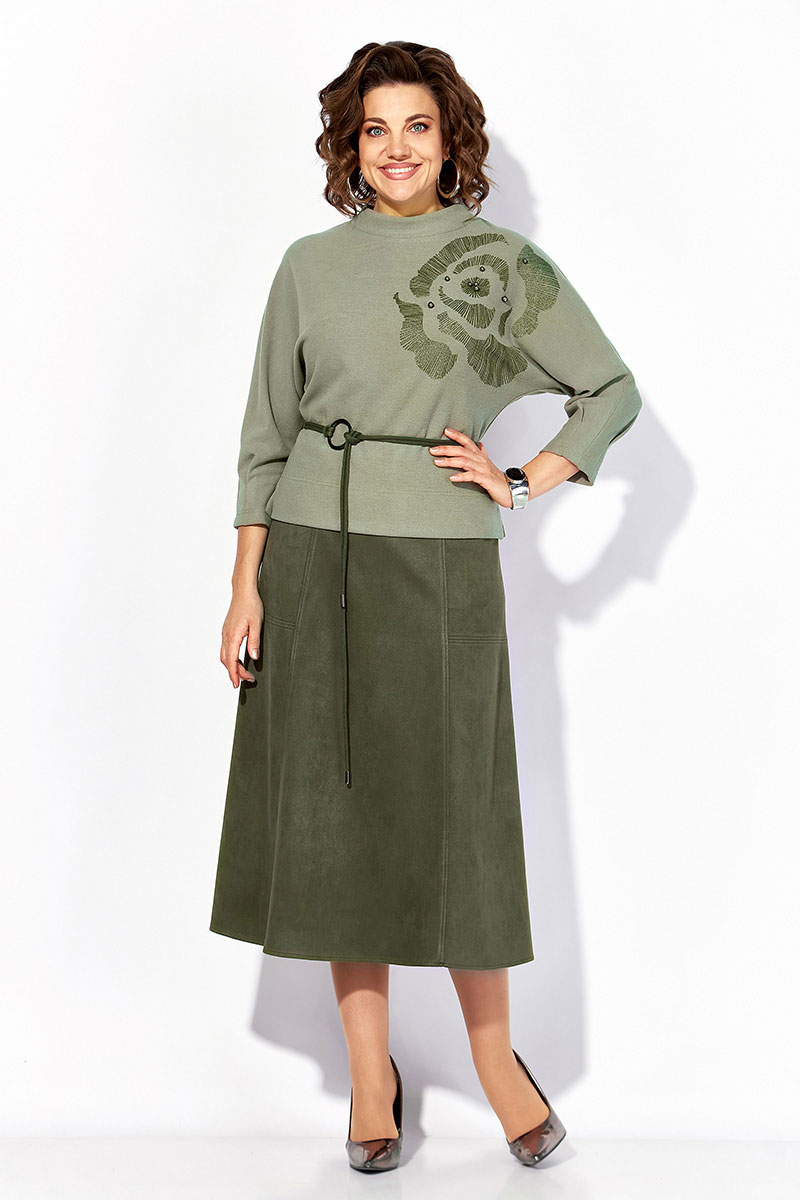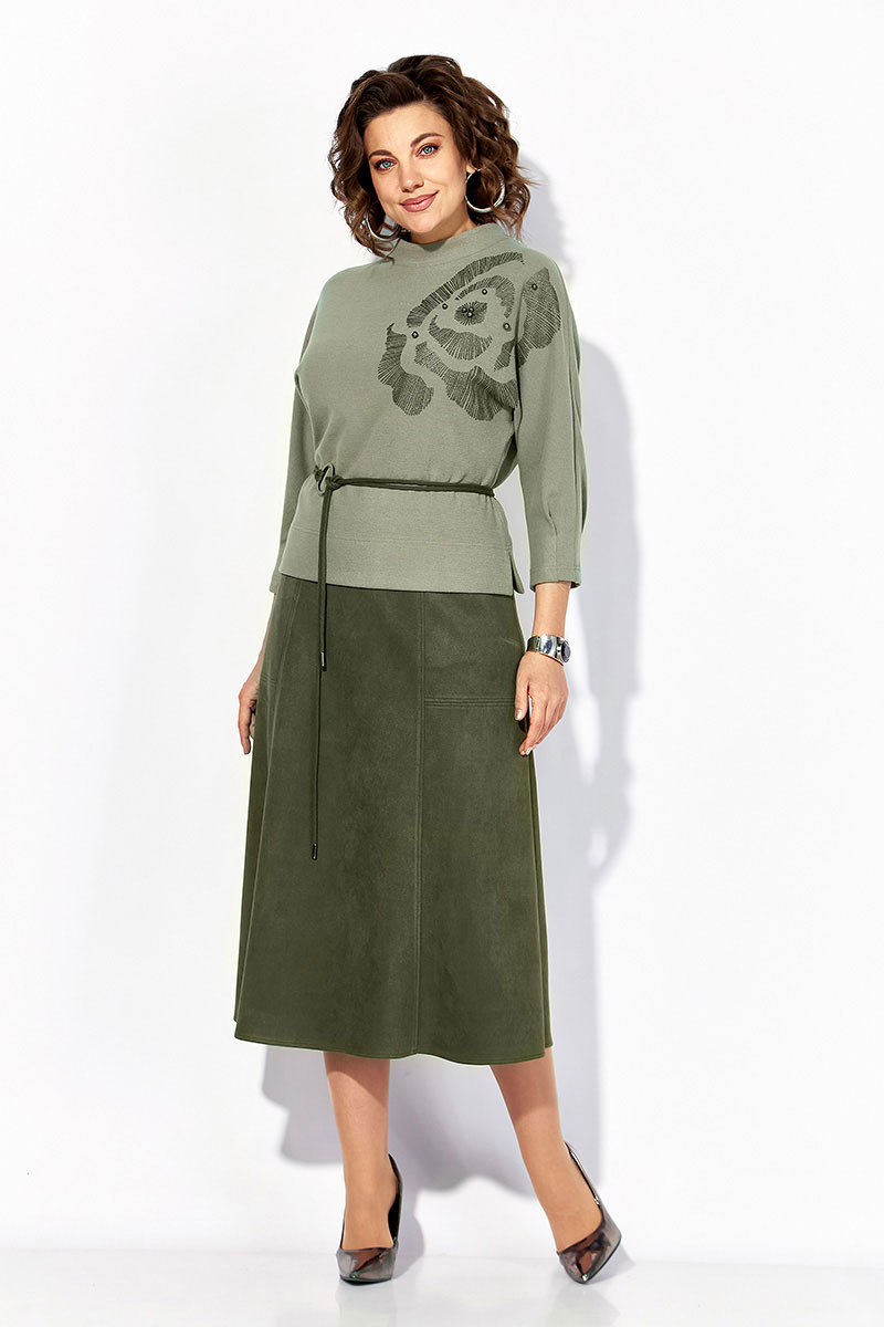 Блузка свободного силуэта, с цельнокроеным рукавом длиной ¾-ти, выполнена из мягкого трикотажа с бархотным эффектом. По низу рукава заложены небольшие складки. Модель на мягкой стойке-горловине с застежкой на потайную молнию по спинке. Лиф украшает ассиметричная печать-накат в виде цветка с бусинами. Широкая подгибка с боковыми разрезами обеспечивает идеальную посадку. Талию можно подчеркнуть съёмным поясом с металлической пряжкой. Юбка в комплекте выполнена из искусственной замши – спандекса, на подкладке. Перед с продольными рельефами на расклешение и боковыми карманами. Пояс в юбке притачной, в боковых участках вставлена резинка для комфортного прилегания. Застежка – юбочная тесьма-молния в среднем шве.