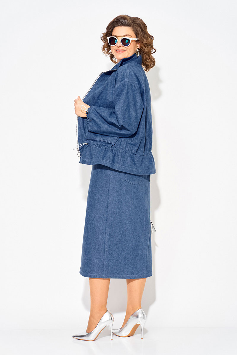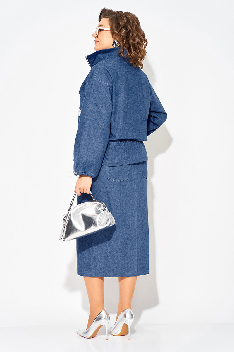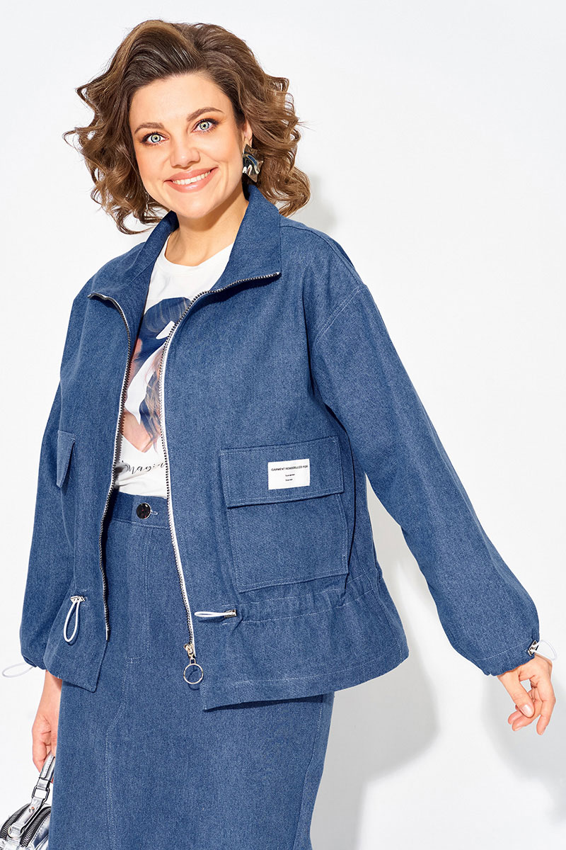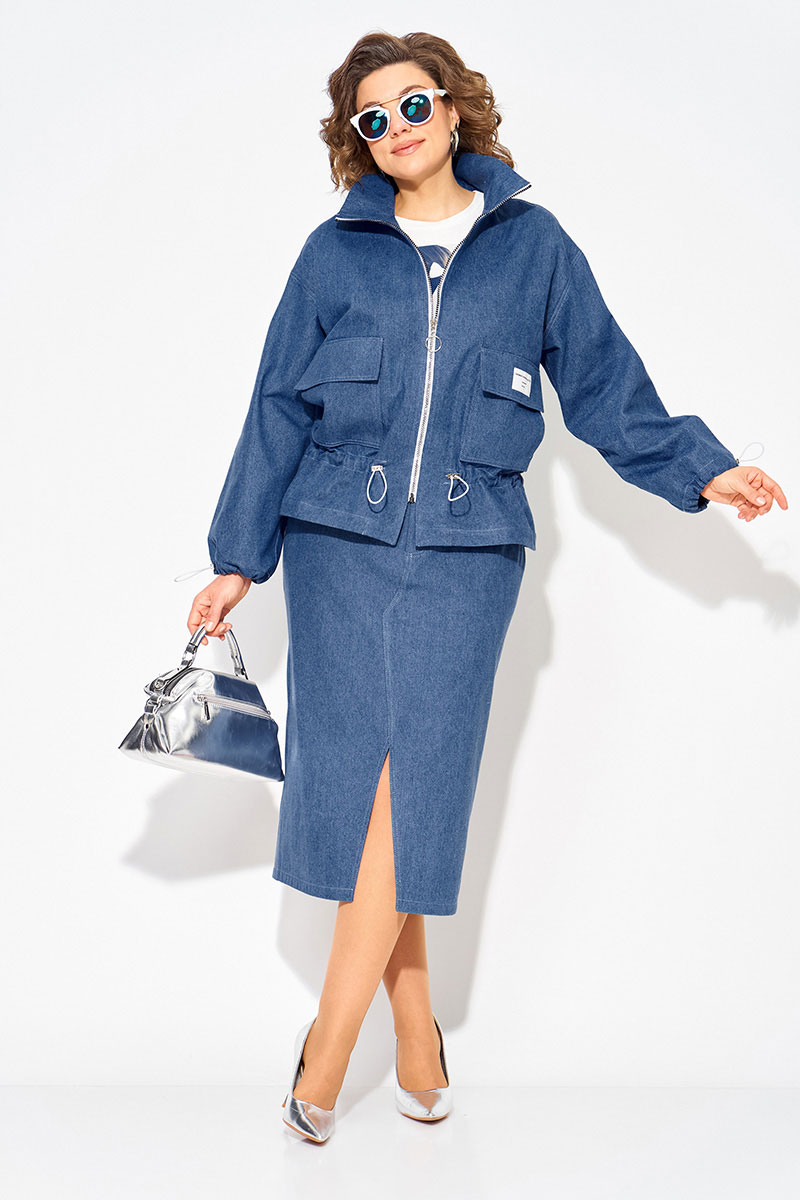 Модный и стильный юбочный женский костюм из денима с жакетом и юбкой — идеальный выбор для создания стильного образа! Жакет свободного силуэта, по типу «джинсовки» с застежкой на молнию. Воротник-стойка, комфортно прилегает к горловине. Рукав длинный, на спущенном плечевом поясе. Низ рукава оформлен на кулиску. Полочка с накладными карманами с клапаном. Чуть ниже талии предусмотрена кулиска для комфортного и более плотного прилегания. Юбка в костюме длиной миди, слегка заужена к низу. Застежка-брючная тесьма-молния с обработанным гульфиком. Пояс притачной, в боковых участках вставлена резинка. В юбке предусмотрены боковые карманы, а также накладные карманы сзади. Фигурный разрез по центру привлекает внимание окружающих!
